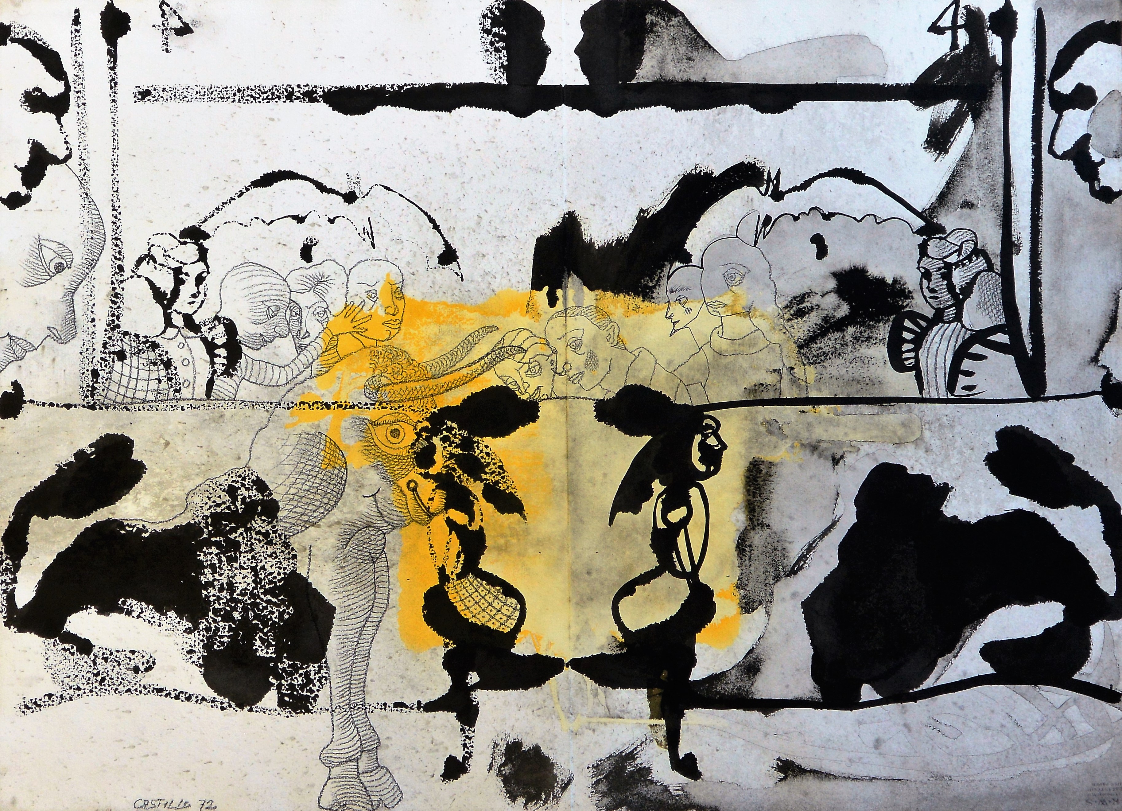 Castillo Jorge 1972, Toro sonriente en Vista Alegre, tinta china y lápiz graso papel, 57×79 cms.