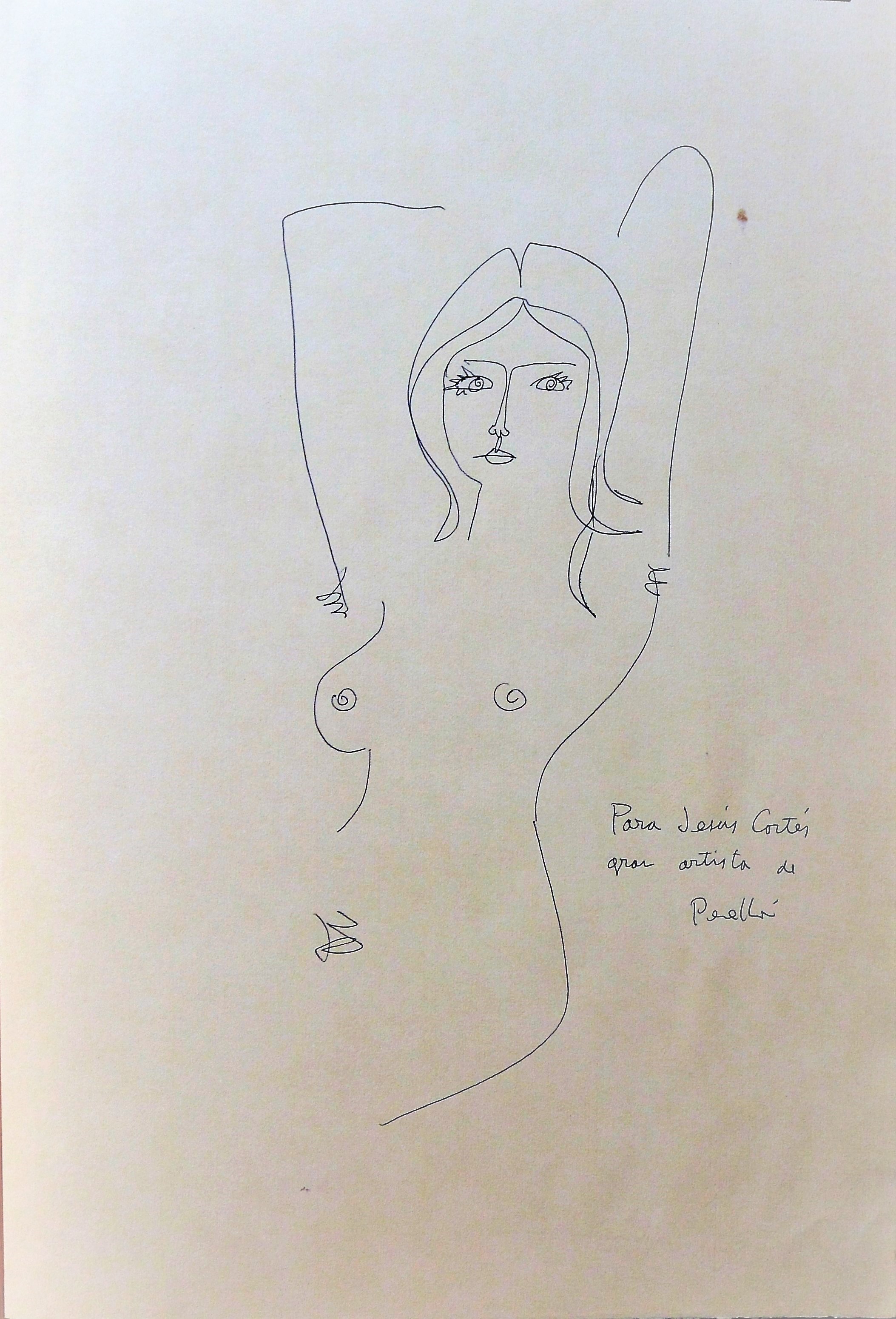 Celedonio Perellón, Joven desnuda sentada brazos en alto, dibujo original tinta china, 50,50×35 cms. Dedicado al encuadernador Jesús Cortés