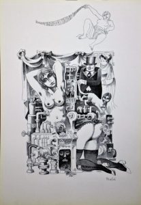 Celedonio Perellón, Mundo, Inauguración, litografía perteneciente a la carpeta Mundo Demonio y Carne, edición 266 ejemplares, numerado y firmado a lápiz, 49,50×34,50 cms.