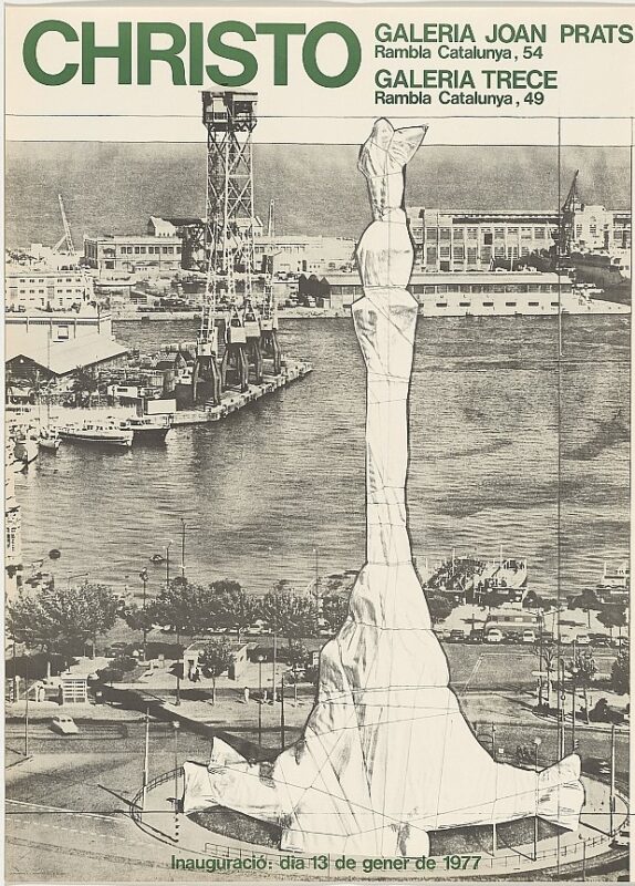 Christo Javacheff, Wrapped monument to Columbus in Barcelona, cartel original litográfico exposición en Galeria Joan Prats y Galeria Trece de Barcelona en 1977, 76×56 cms.