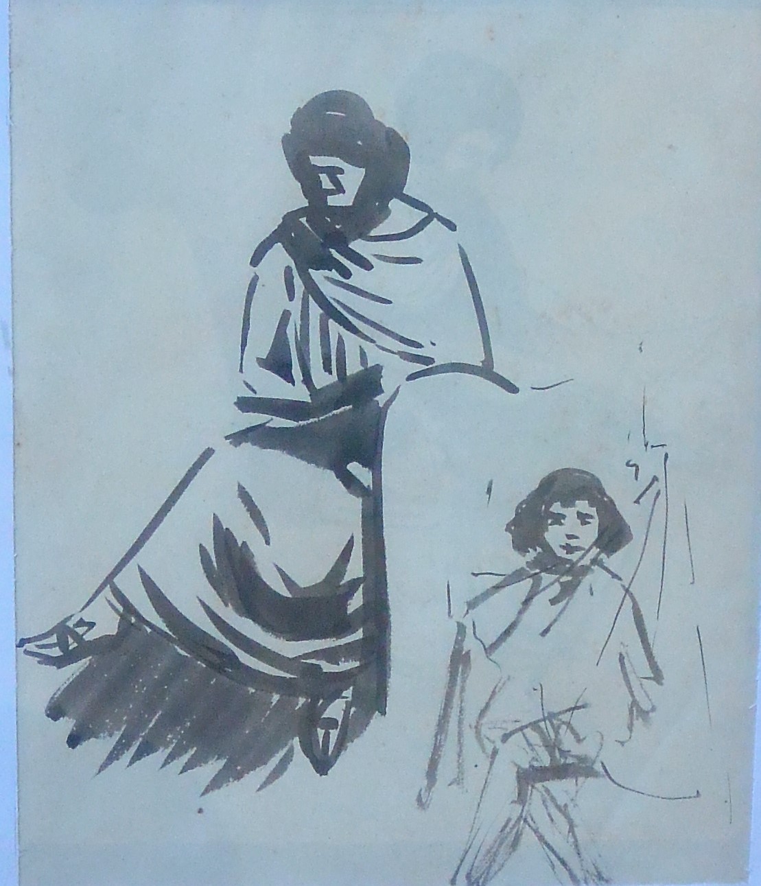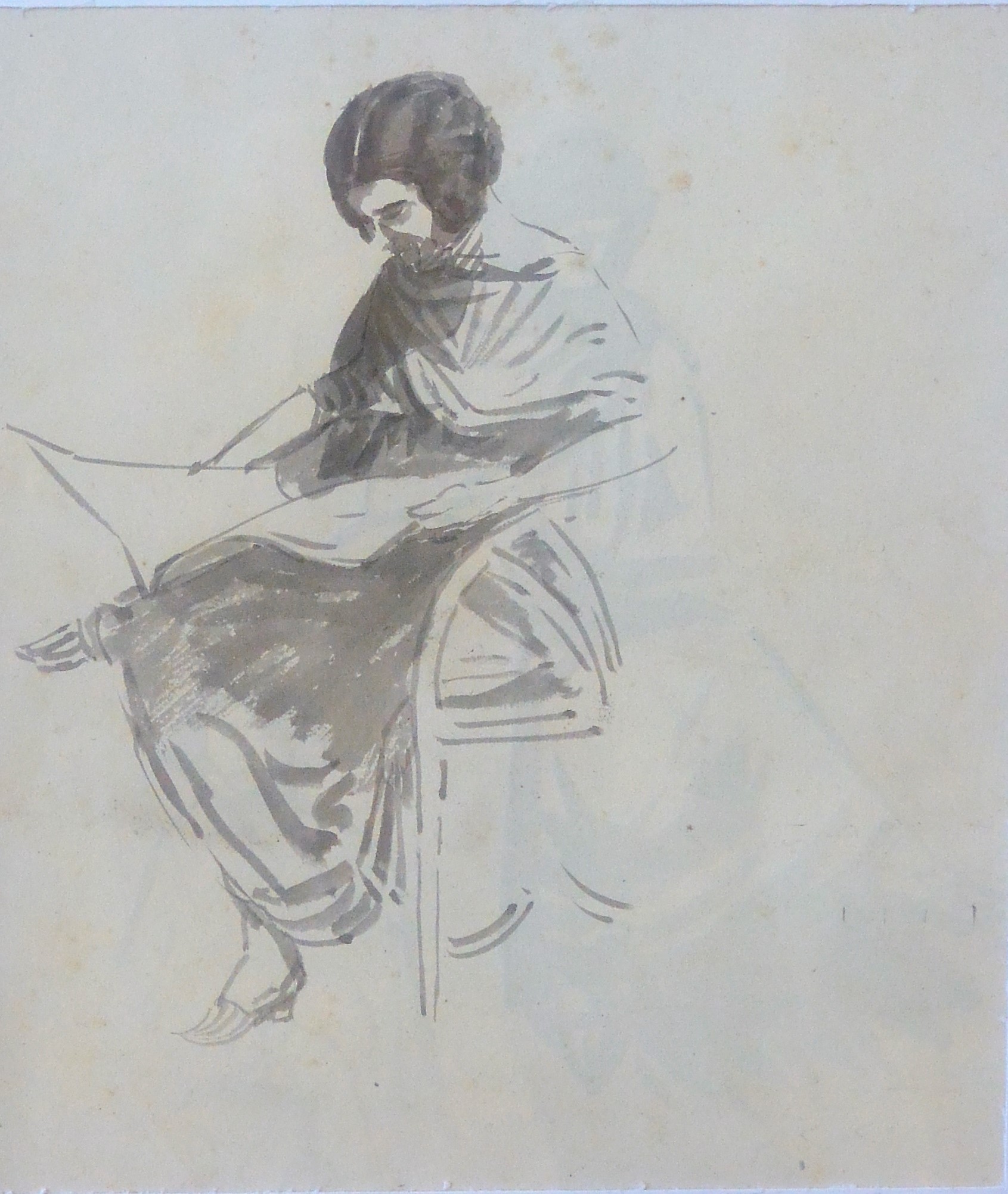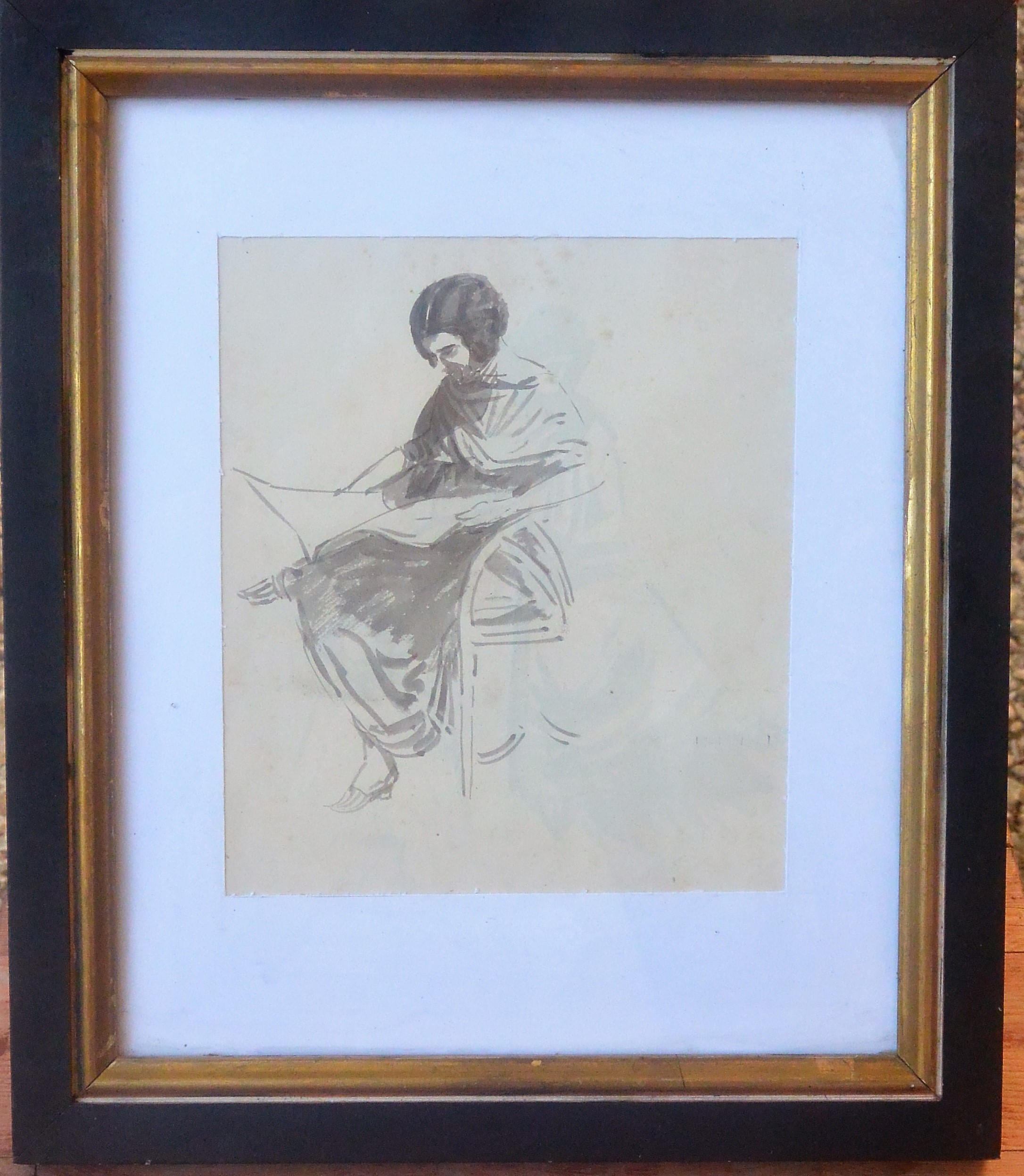 Cristino Mallo, Mujer sentada leyendo, dibujo aguada papel, enmarcado, dibujo 22,50×19 cms. y marco 38,50×33 cms.
