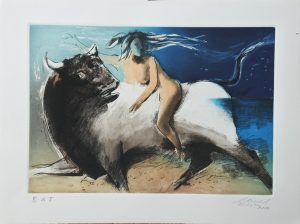 Daniel Merino, Mujer cabalgando un toro, grabado aguafuerte, justificado bat y firmado a lápiz, plancha 28×40 cms. y papel 37×50 cms.