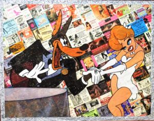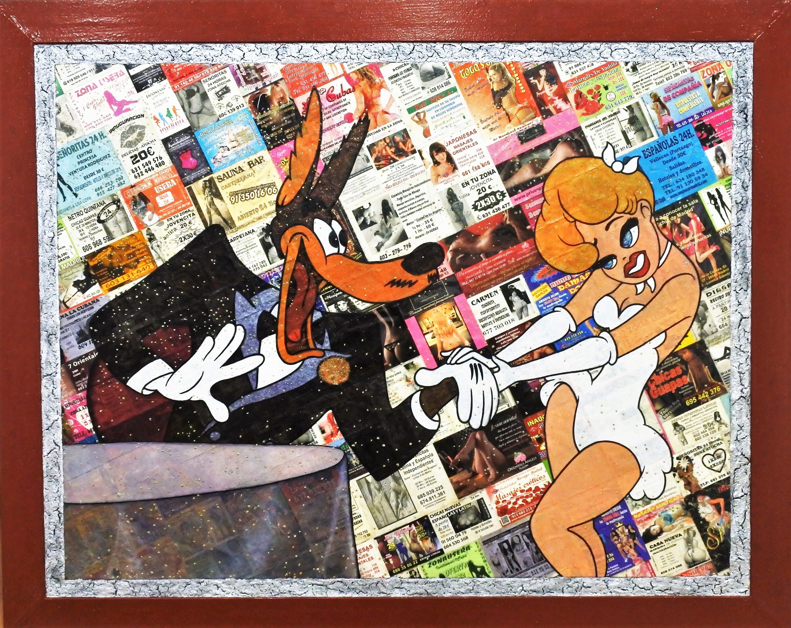 Daniel P. Decker, El no ya lo tienes, pintura original oleo sobre collage de panfletos de ocio adulto, enmarcado, pintura 89×115 cms. y marco 103×128 cms.