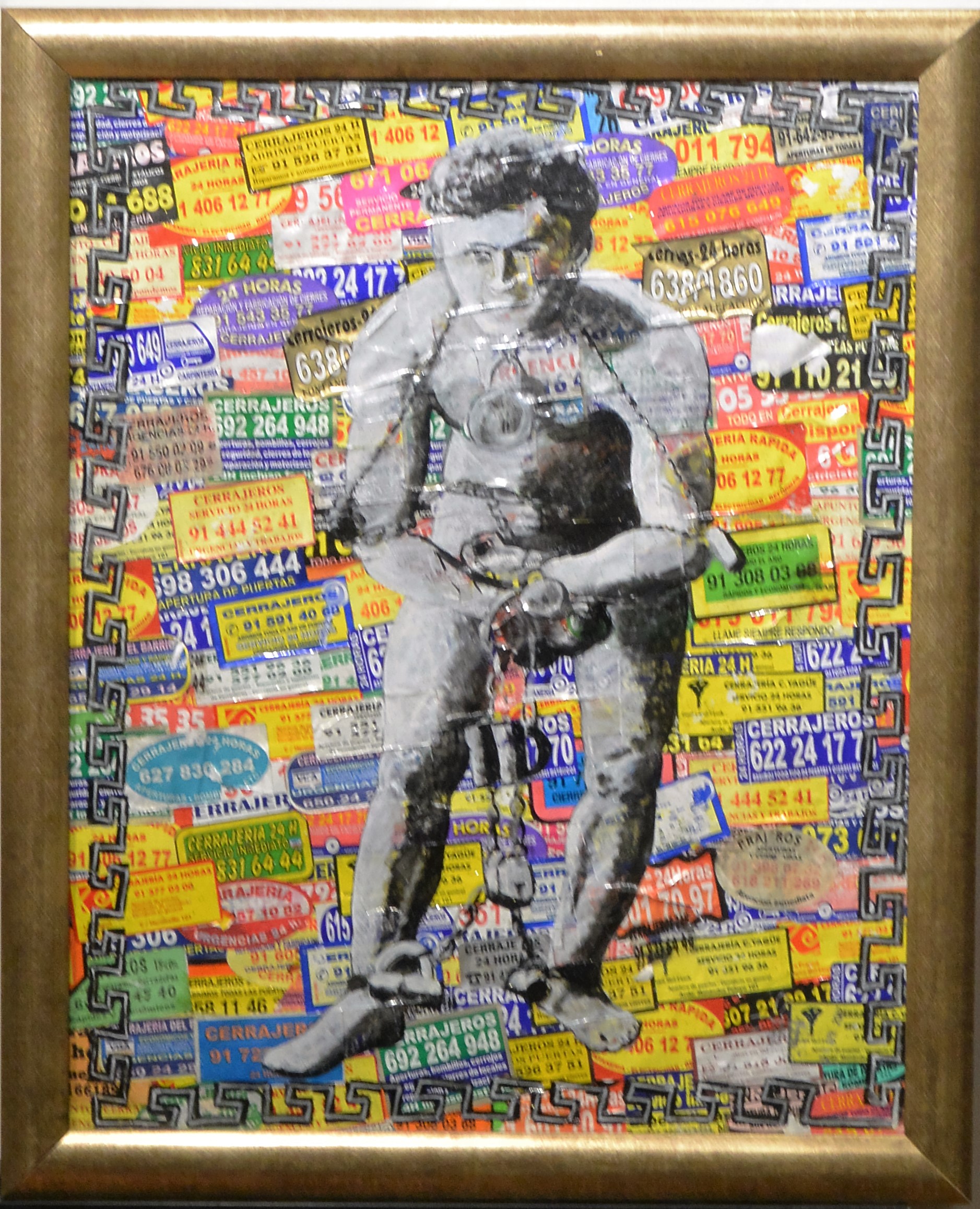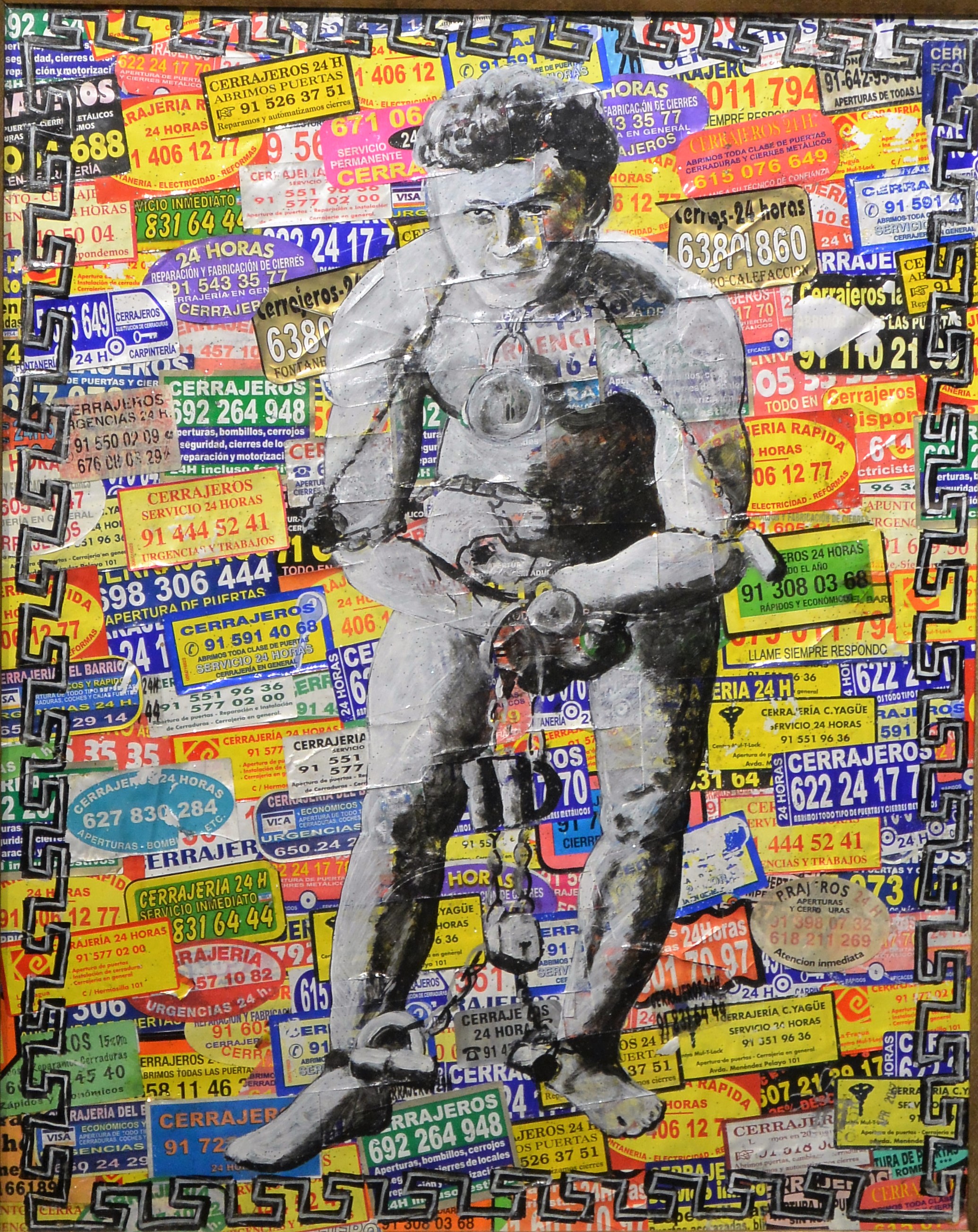 Daniel P. Decker, Houdini el cerrajero, pintura técnica mixta sobre anuncios de cerrajerías, enmarcado, dibujo 50×40 y marco 55×45 cms.