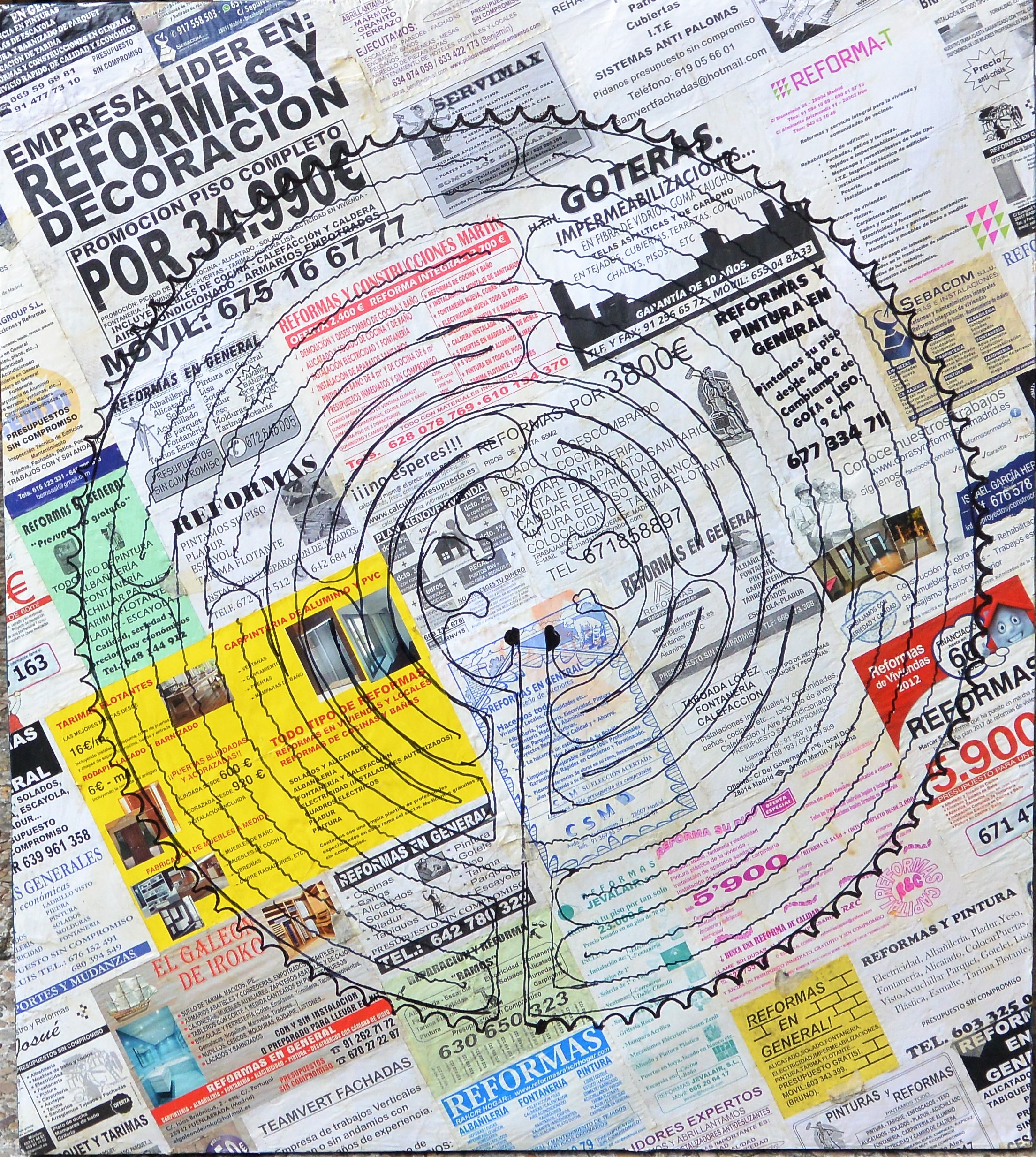 Daniel P. Decker, Reformas, laberinto, técnica mixta y collage cartón, 80×90 cms.