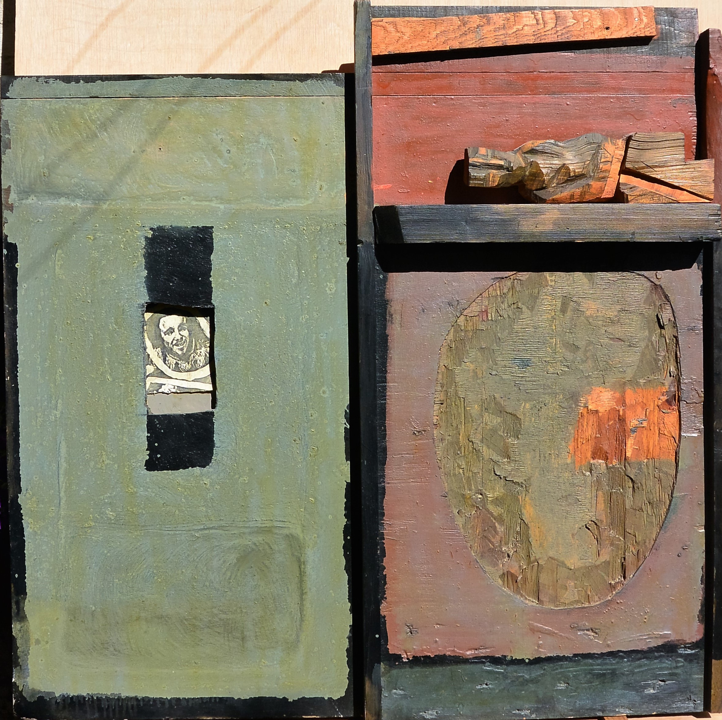 David Lechuga 1988, El sueño del durmiente, pintura técnica mixta y escultura madera, 92×90 cms. (irregular)