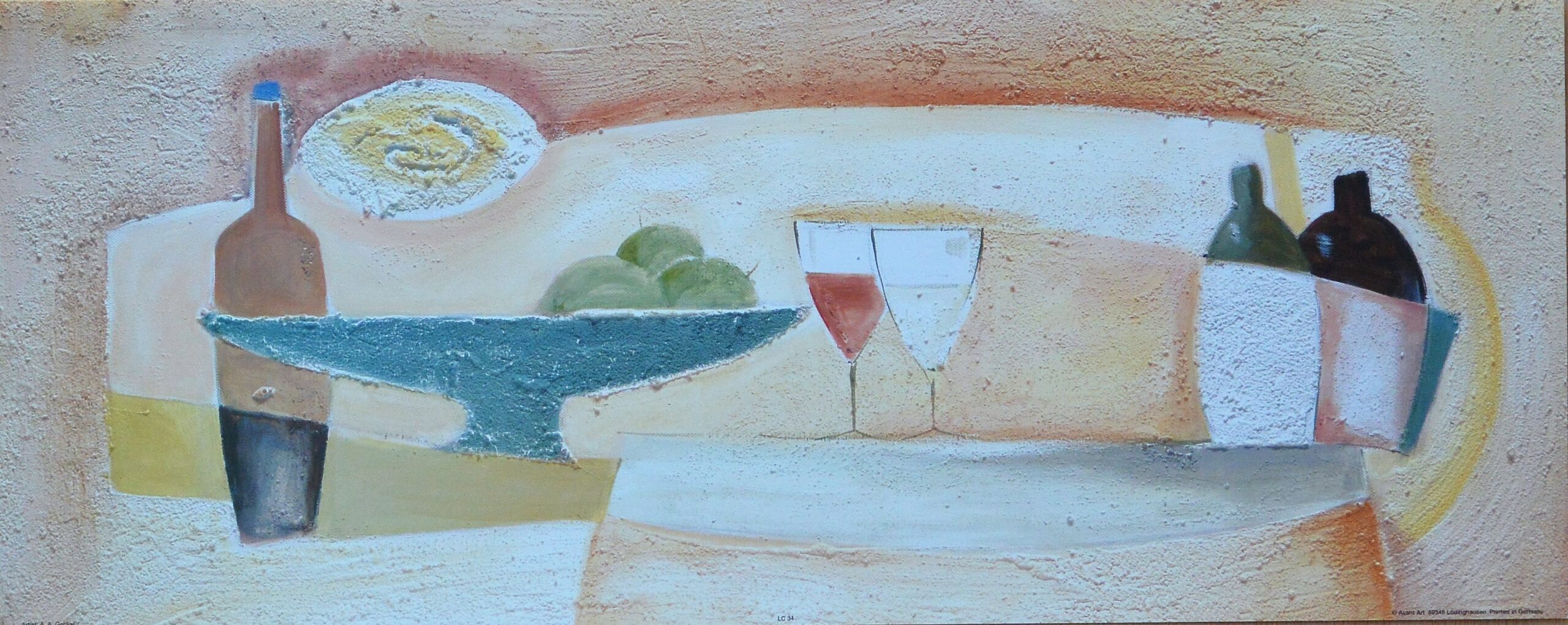 Decoración, Bodegón con frutero y copas de vino, cartel, 20×60 cms.