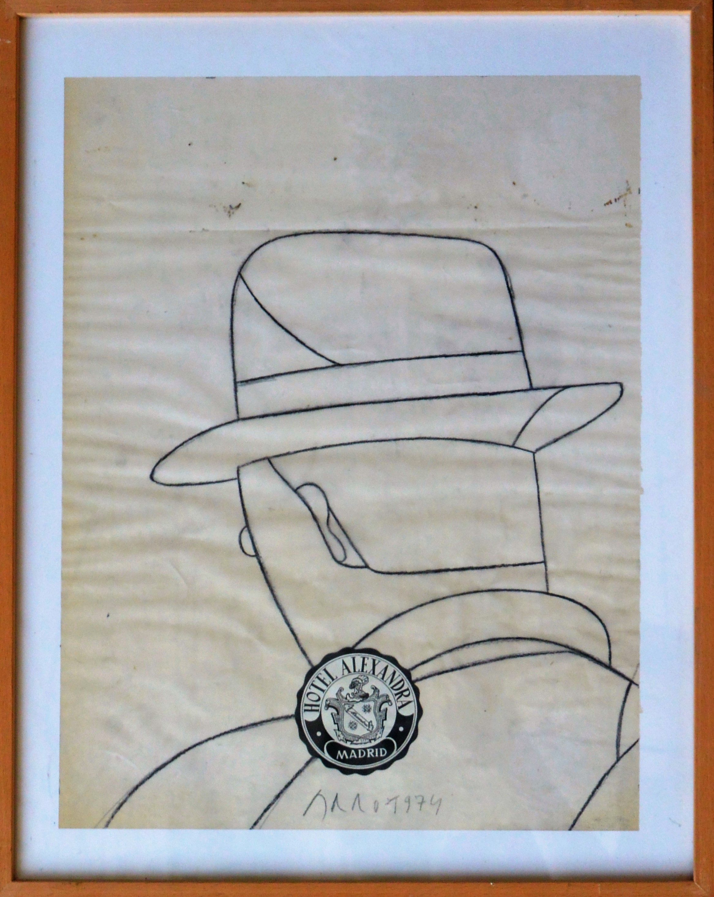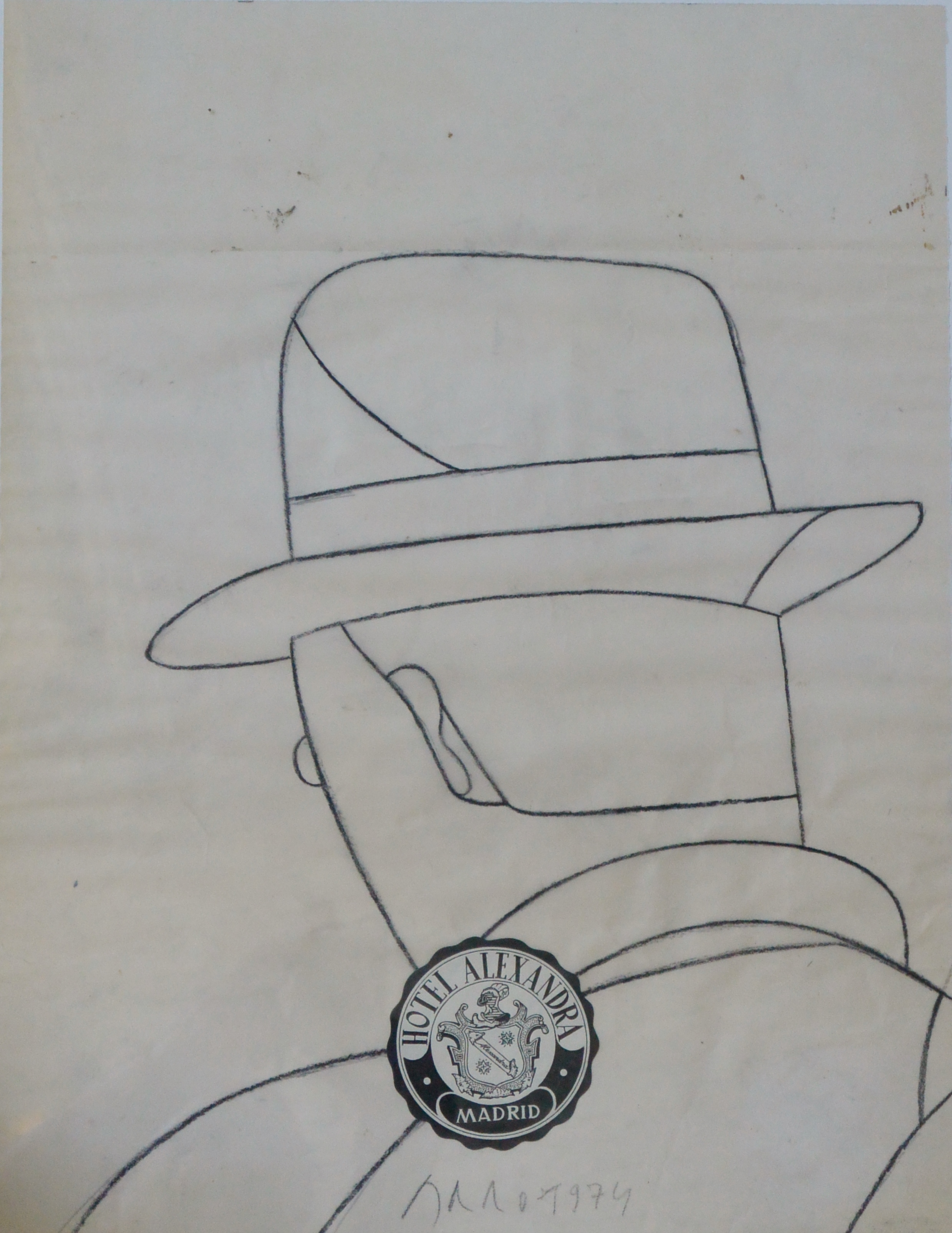 Eduardo Arroyo 1974, Fausto, dibujo original carboncillo graso y collage cartulina, enmarcado, obra 47×36 cms. y marco 57×45 cms.
