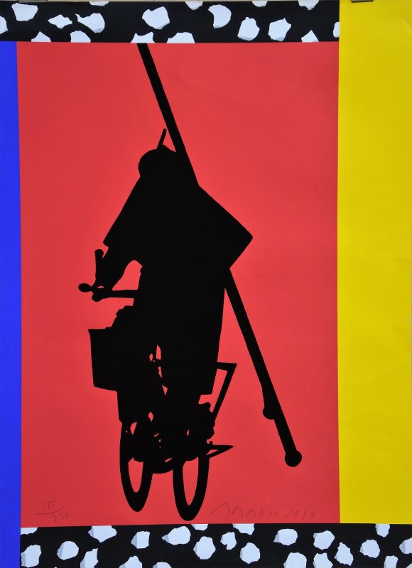 Eduardo Arroyo, Deshollinador en bicicleta, serigrafía, edición 250 ejemplares, numerado, datado y firmado a lápiz, 76×56 cms.