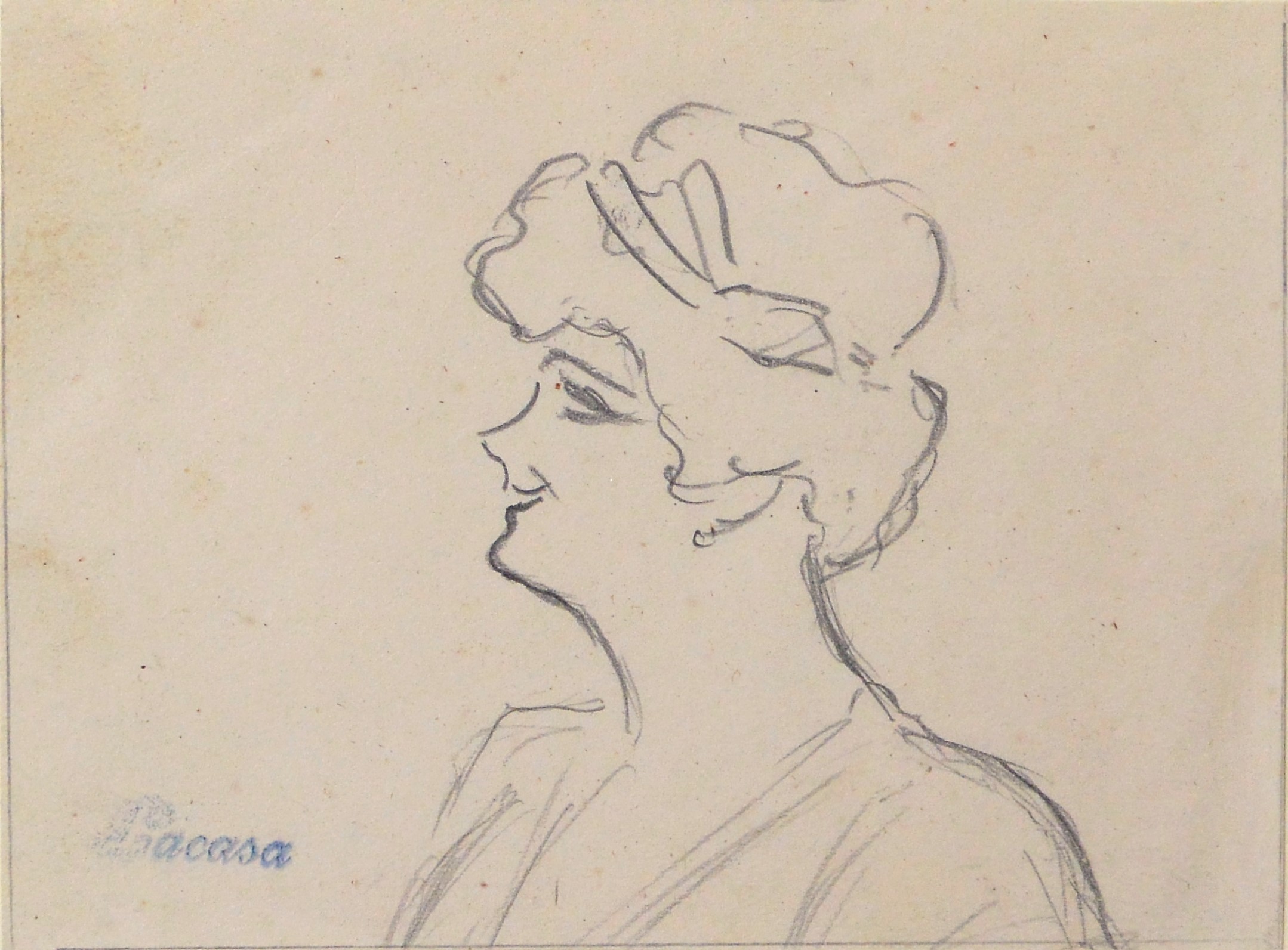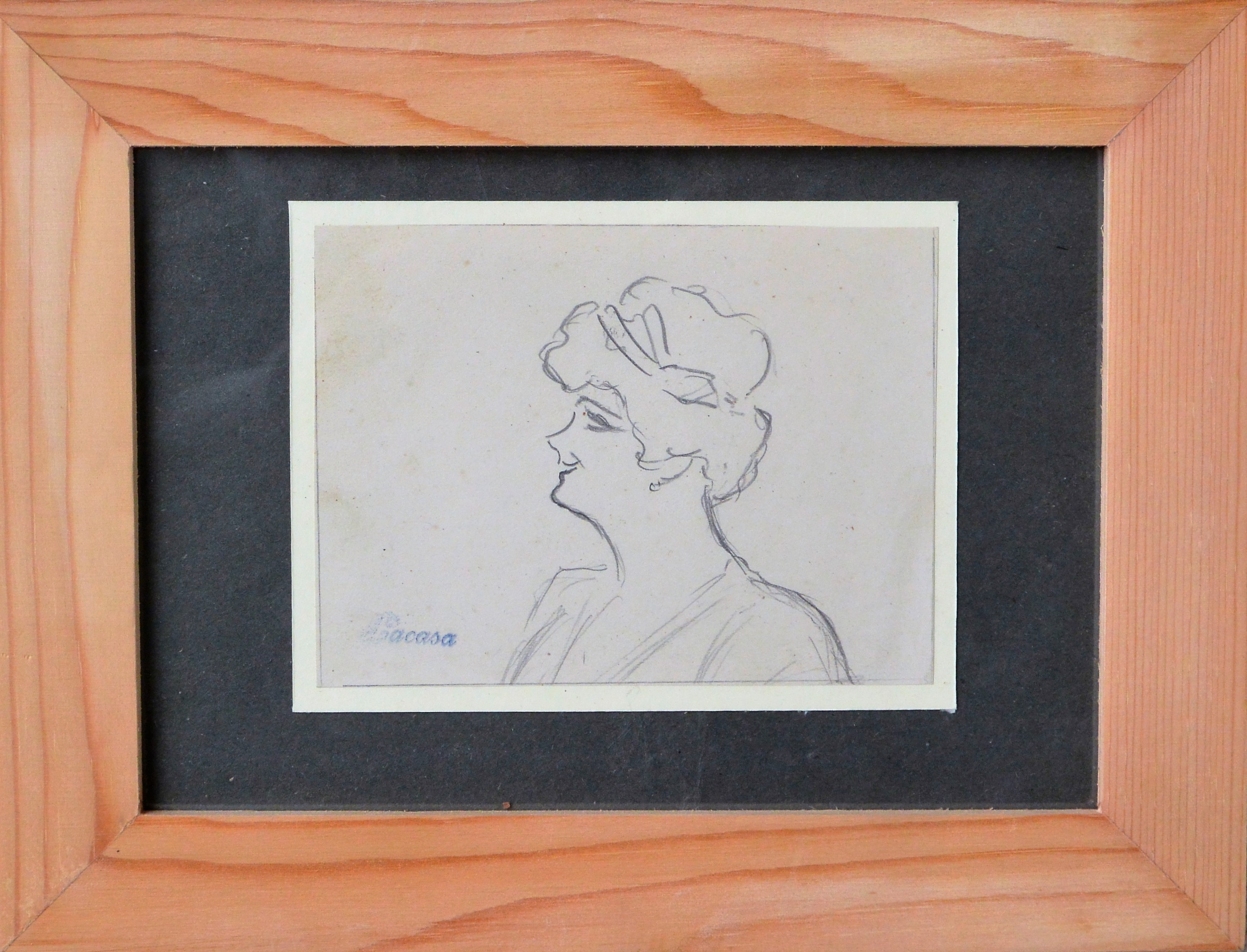 Enrique Lacasa y Perla, Mujer sonriente de perfil, dibujo lápiz papel, enmarcado, papel 8×10,50 y marco 16×21 cms.