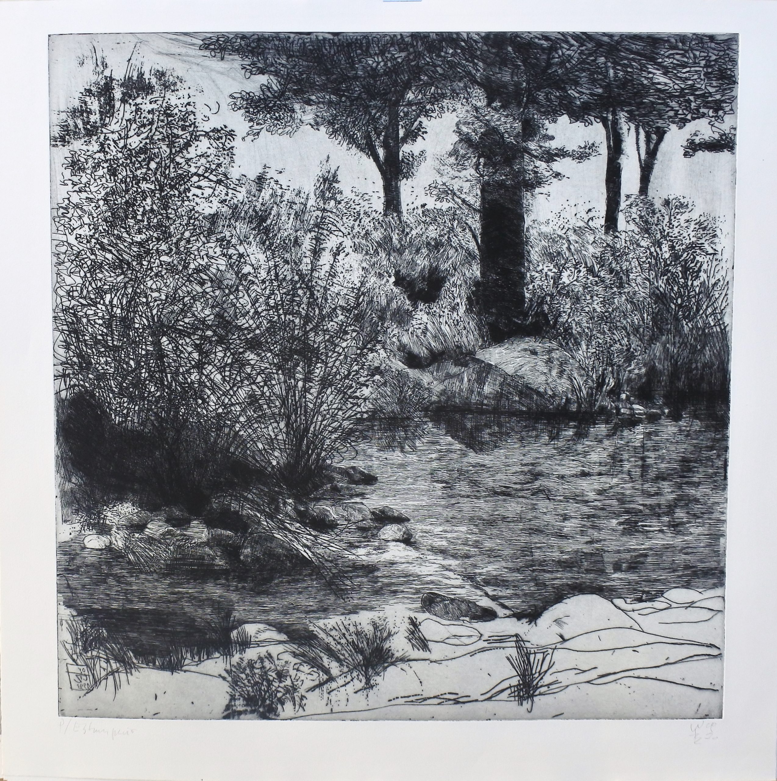 Enrique Ortiz, Paisaje con rio, grabado aguafuerte, prueba de estampador, firmado a lápiz, plancha 70×70 cms. y papel 80×80 cms.