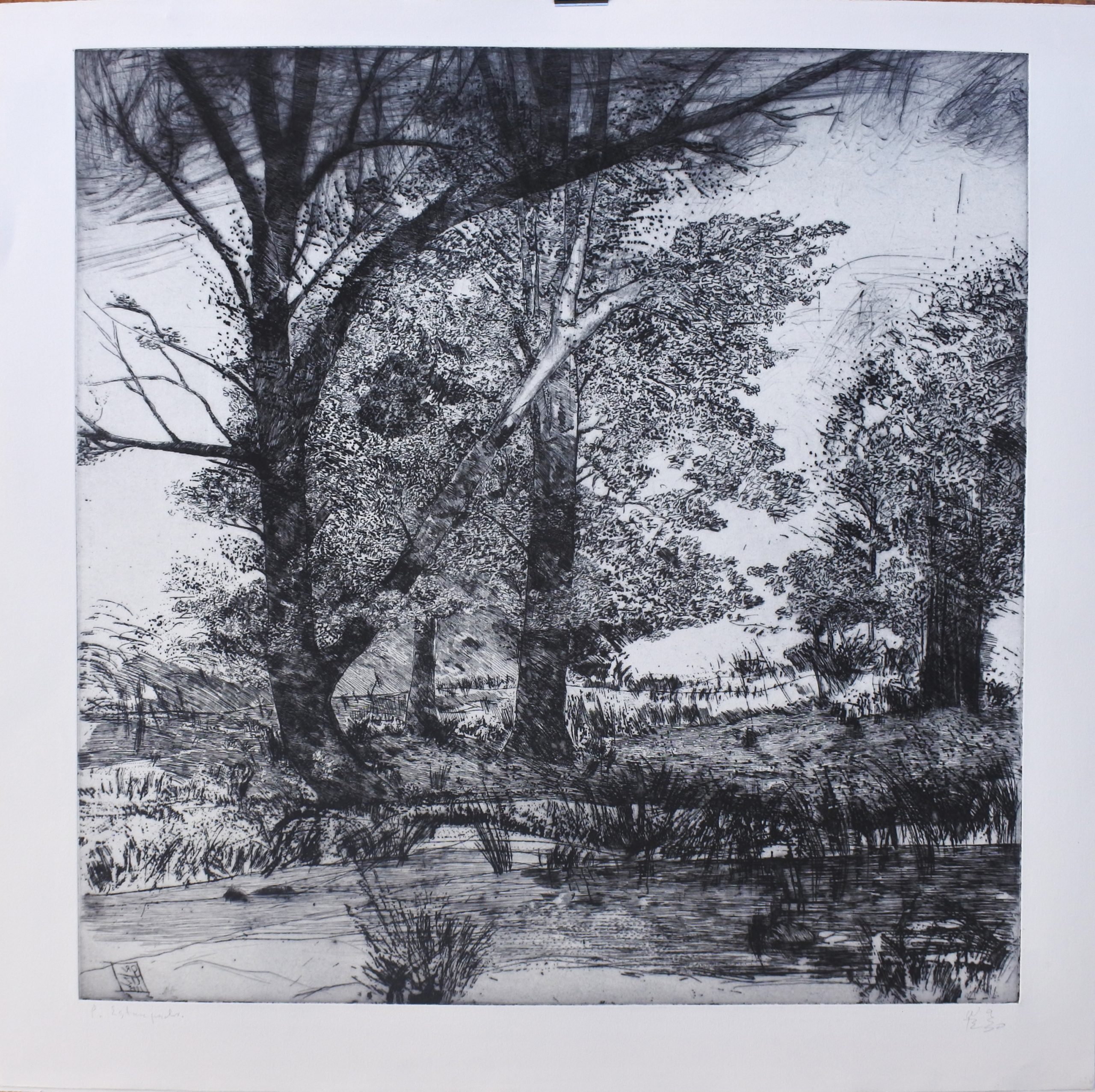 Enrique Ortiz, Paisaje invernal, grabado aguafuerte, prueba de estampador, firmado a lápiz, plancha 70×70 cms. y papel 80×80 cms.