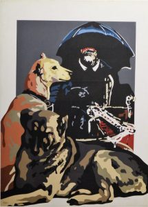 Equipo Crónica, El Banquero, serigrafía original, editada en 1972, edición 100 ejemplares, numerada y firmada a lápiz, enmarcada, serigrafía 75×55 cms. y marco 96,50×77,50 cms.