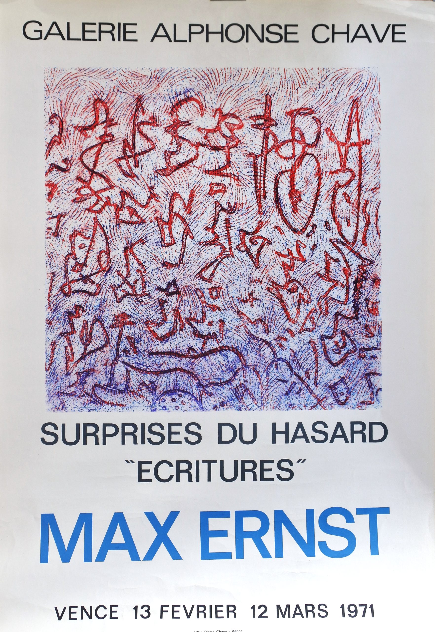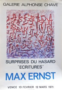 Ernst Max, Surprises du hasard, ecritures, cartel original exposición en Galerie Alphonse Chave Vence en 1971, 68×47 cms.