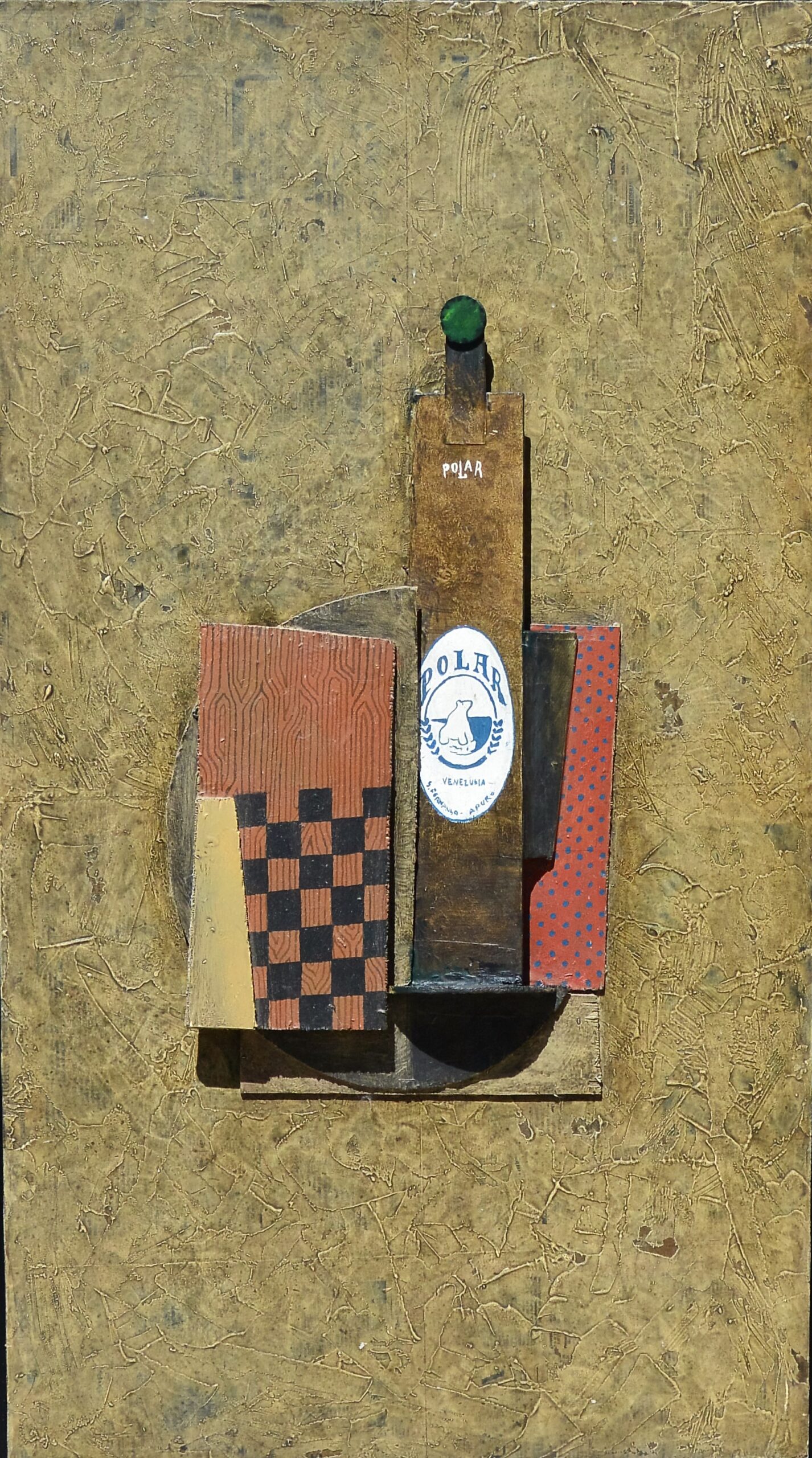 Fernando Bellver 1994, Polar, serie cervezas, técnica mixta y collage tabla, enmarcado, pintura 90×50,50 cms. y marco 96,50x 57 cms.