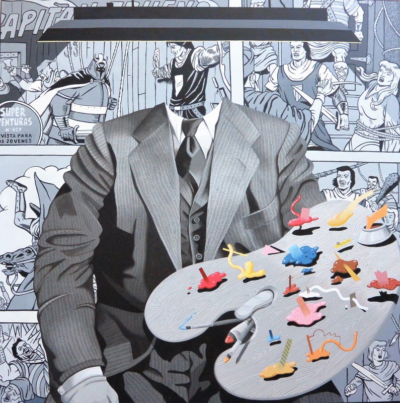Fernando Bellver 1997, El pintor y el Capitán Trueno, pintura acrílico sobre tablero dm, 122×122 cms.