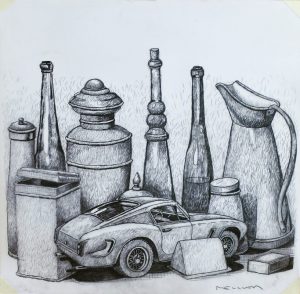 Fernando Bellver, Ferrari swb-Giorgio Morandi, serie coches bodegón, dibujo original grafito sobre papel acetato, 35×36 cms. Preparatorio para aguafuerte