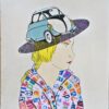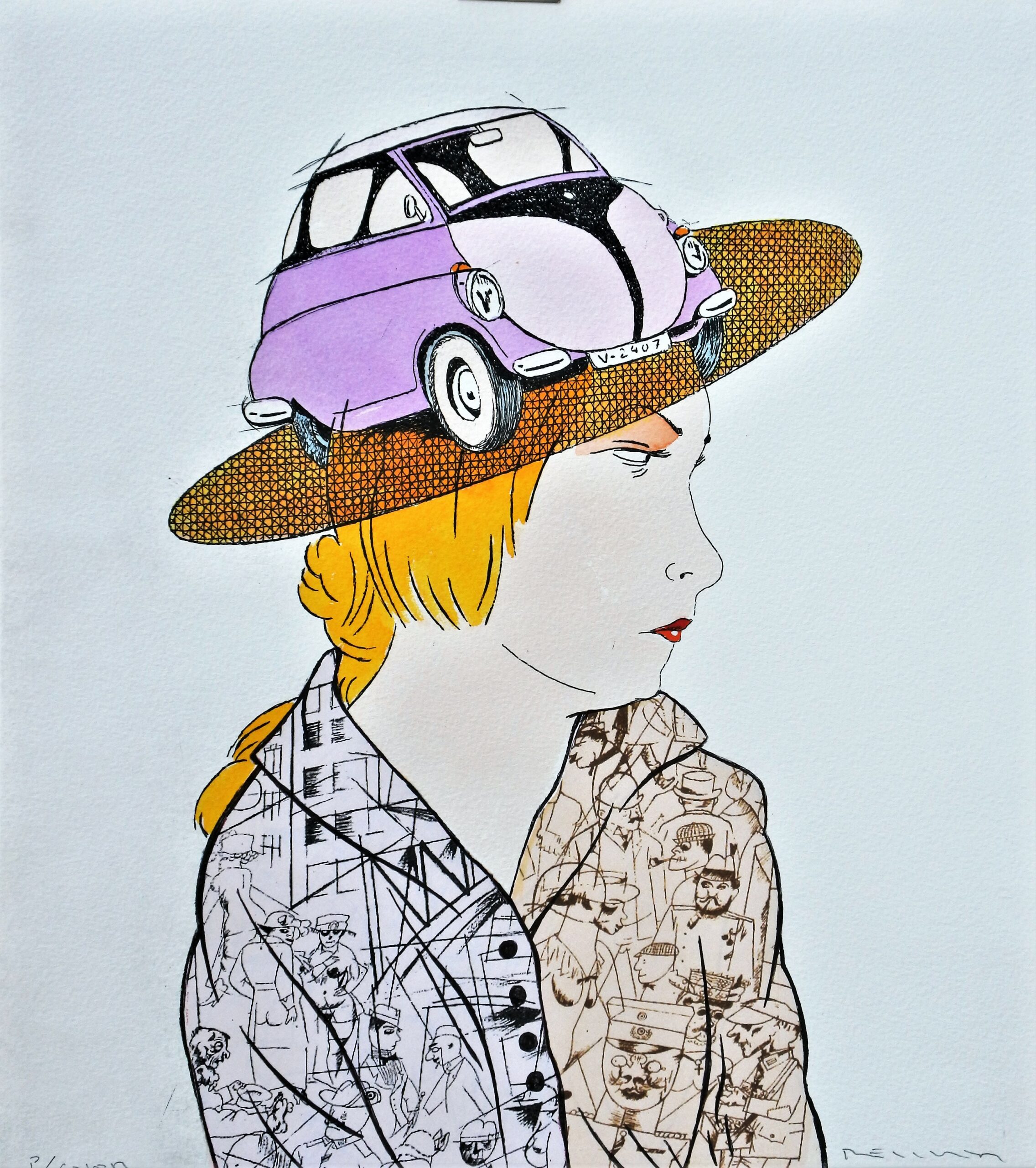 Fernando Bellver – «BMW Isetta-George Grosz, violeta» serie coches-figuras, grabado aguafuerte iluminado a mano y collage