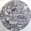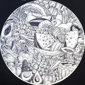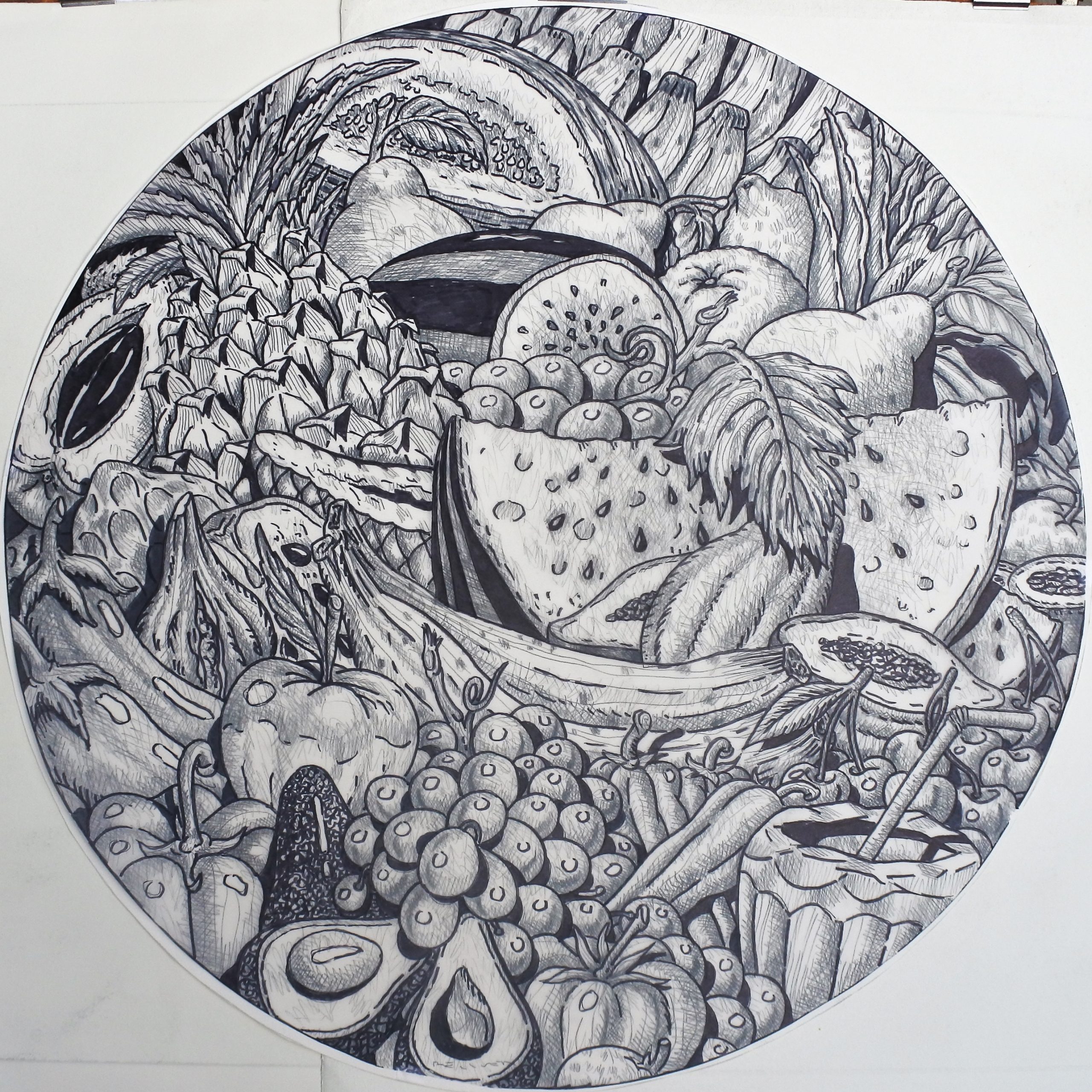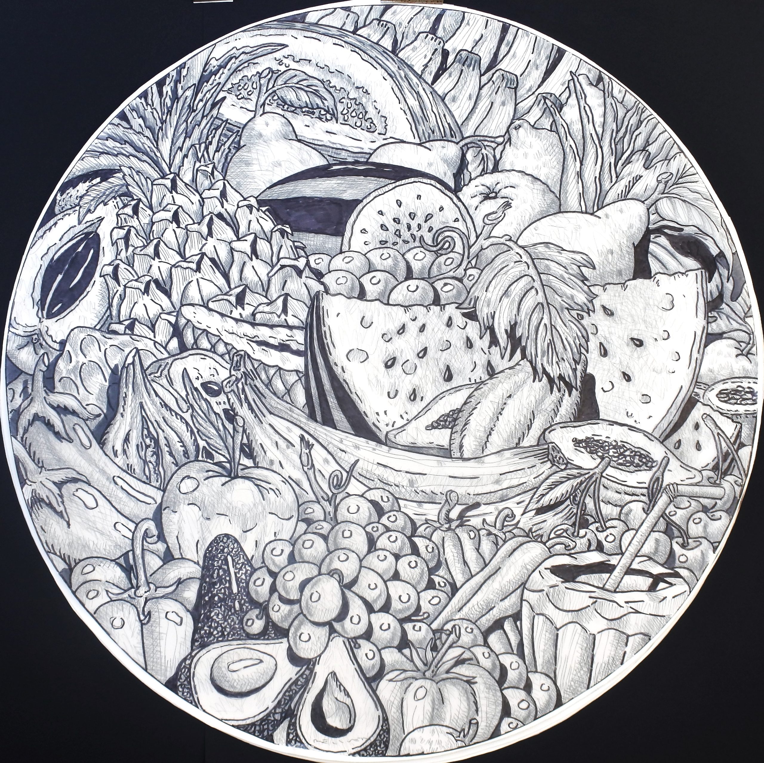 Fernando Bellver, Bodegón tropical, dibujo original lápiz sobre papel de acetato, preparación para grabado, circular, diámetro 75 cms. Firmado por el artista