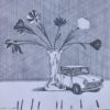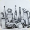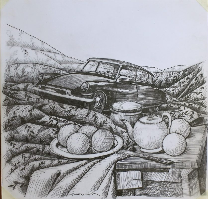 Fernando Bellver, Citroen DS Tiburón-Paul Cezanne, serie coches bodegón, dibujo original grafito acetato papel, 35×36 cms. Preparatorio para aguafuerte