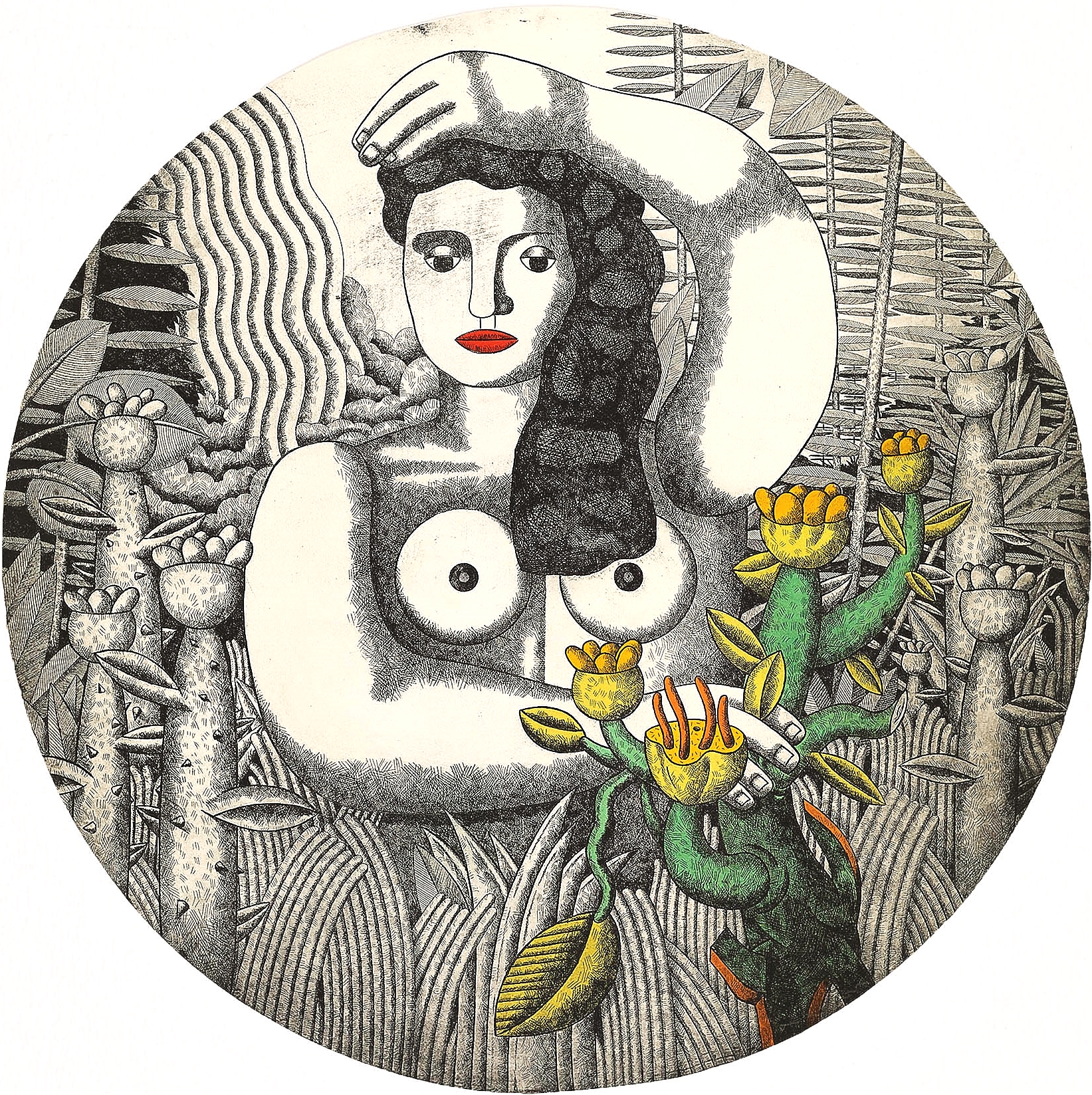 Fernando Bellver, Oceanía, grabado aguafuerte iluminado a mano, edición 50 ejemplares, numerado y firmado a lápiz, 97×97 cms. (Circular)
