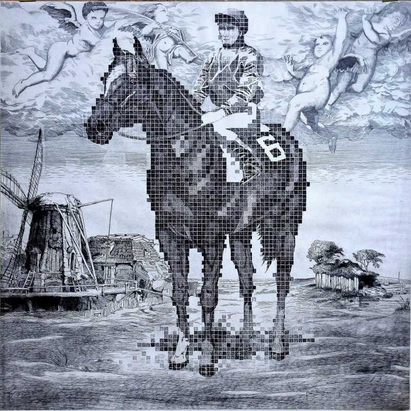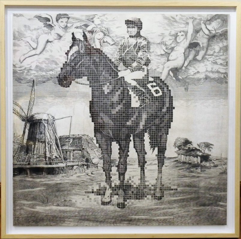 Fernando Bellver, Crónica de una carrera; Murillo Rembrand & Chuck Close, grabado aguafuerte, edición 75 ejemplares, numerado y firmado a lápiz, enmarcado, grabado, 96×96 cms. y marco 106×106 cms.