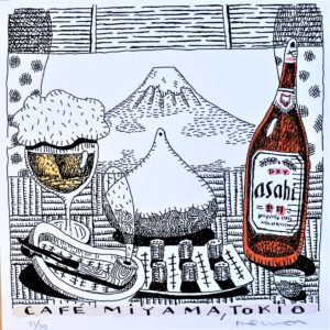 Fernando Bellver, De cervezas por el mundo, Café Miyama, Tokio, litografia iluminada a mano, edición 90 ejemplares, numerada y firmada a lápiz, 21×21 cms.