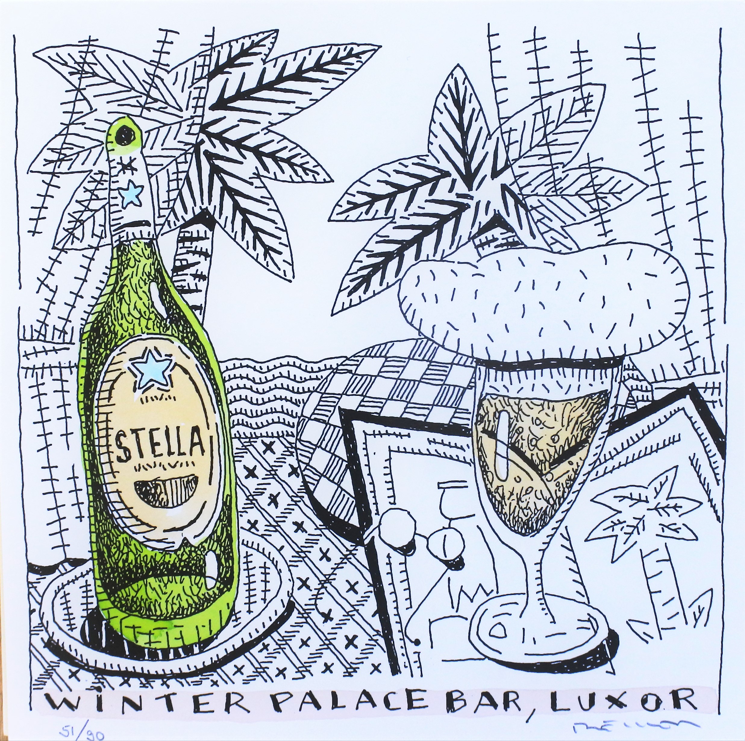 Fernando Bellver, De cervezas por el mundo, Winter Palace bar, Luxor, litografia iluminada a mano, edición 90 ejemplares, numerada y firmada a lápiz, 21×21 cms.