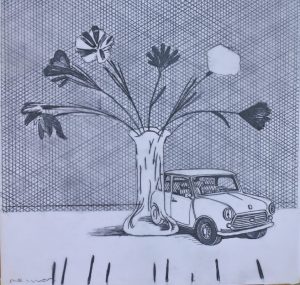 Fernando Bellver – «Mini Austin Cooper- David Hockney» serie coches bodegón, dibujo original grafito sobre acetato papel