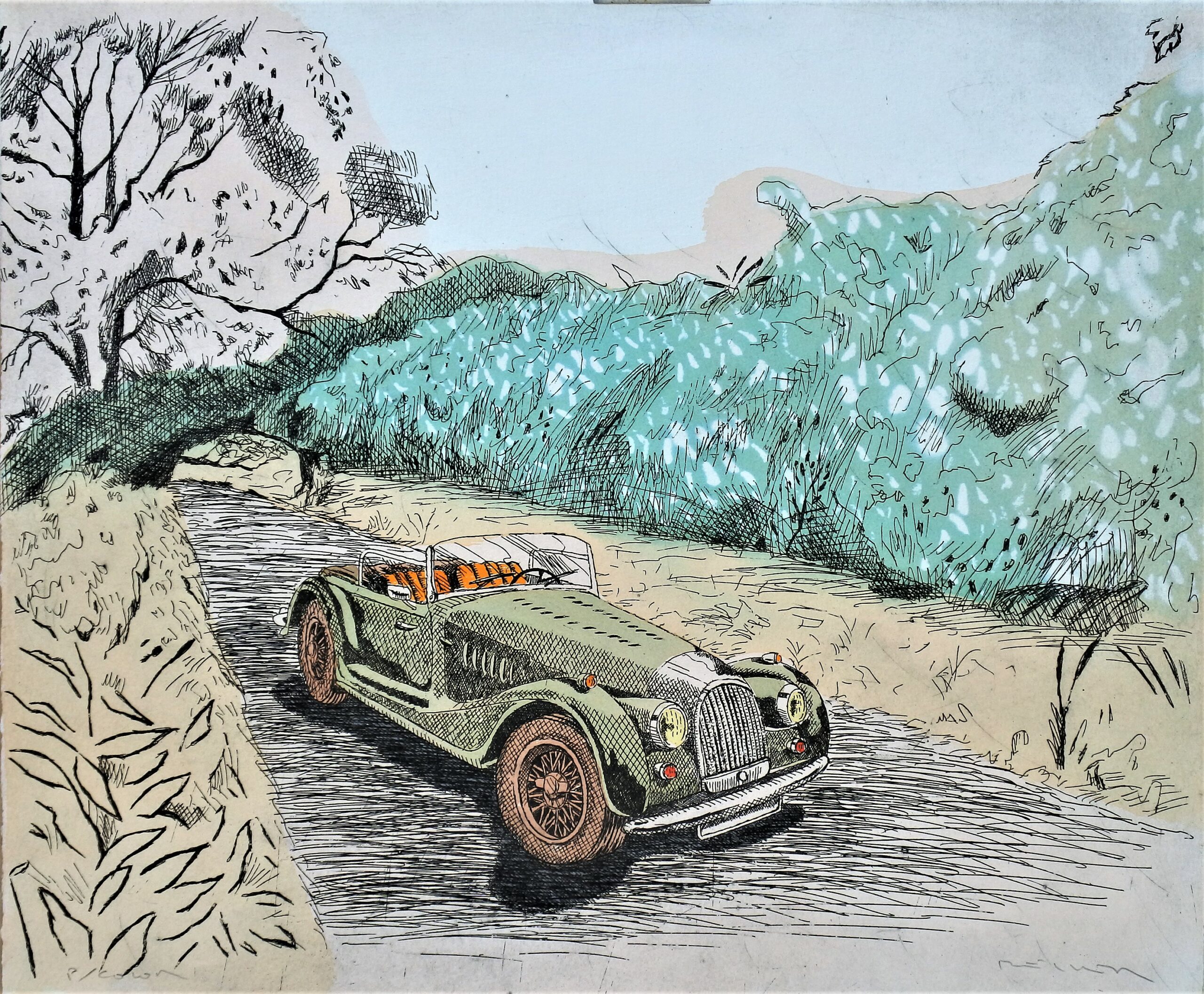 Fernando Bellver, Morgan-Alfred Sisley, verde, grabado aguafuerte iluminado a mano, prueba de color, firmado a lápiz, 33×40 cms