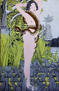 Fernando Bellver, Mujeres Rousseau, grabado aguafuerte iluminado a mano, numerado y firmado a lápiz, papel 98×64 cms.