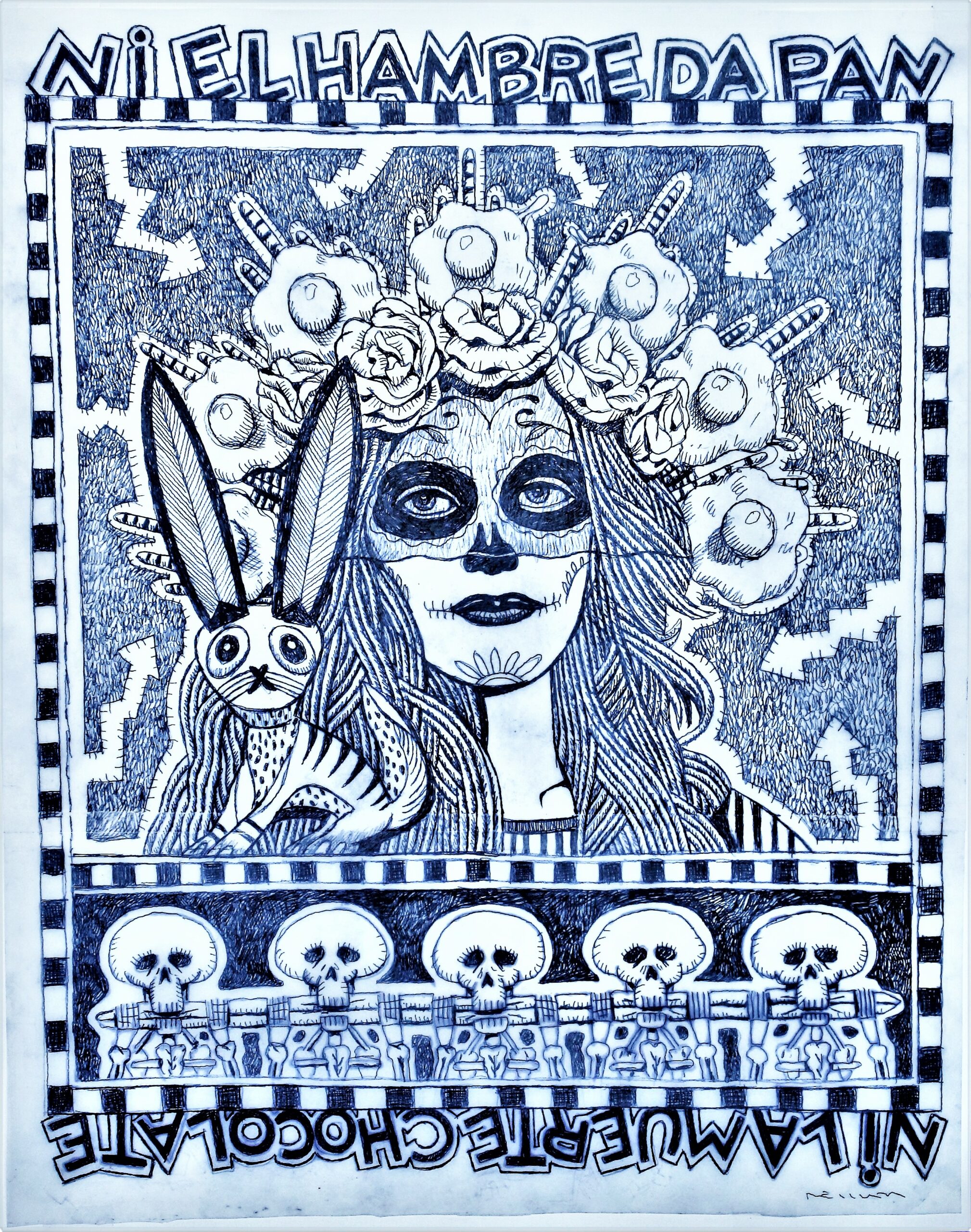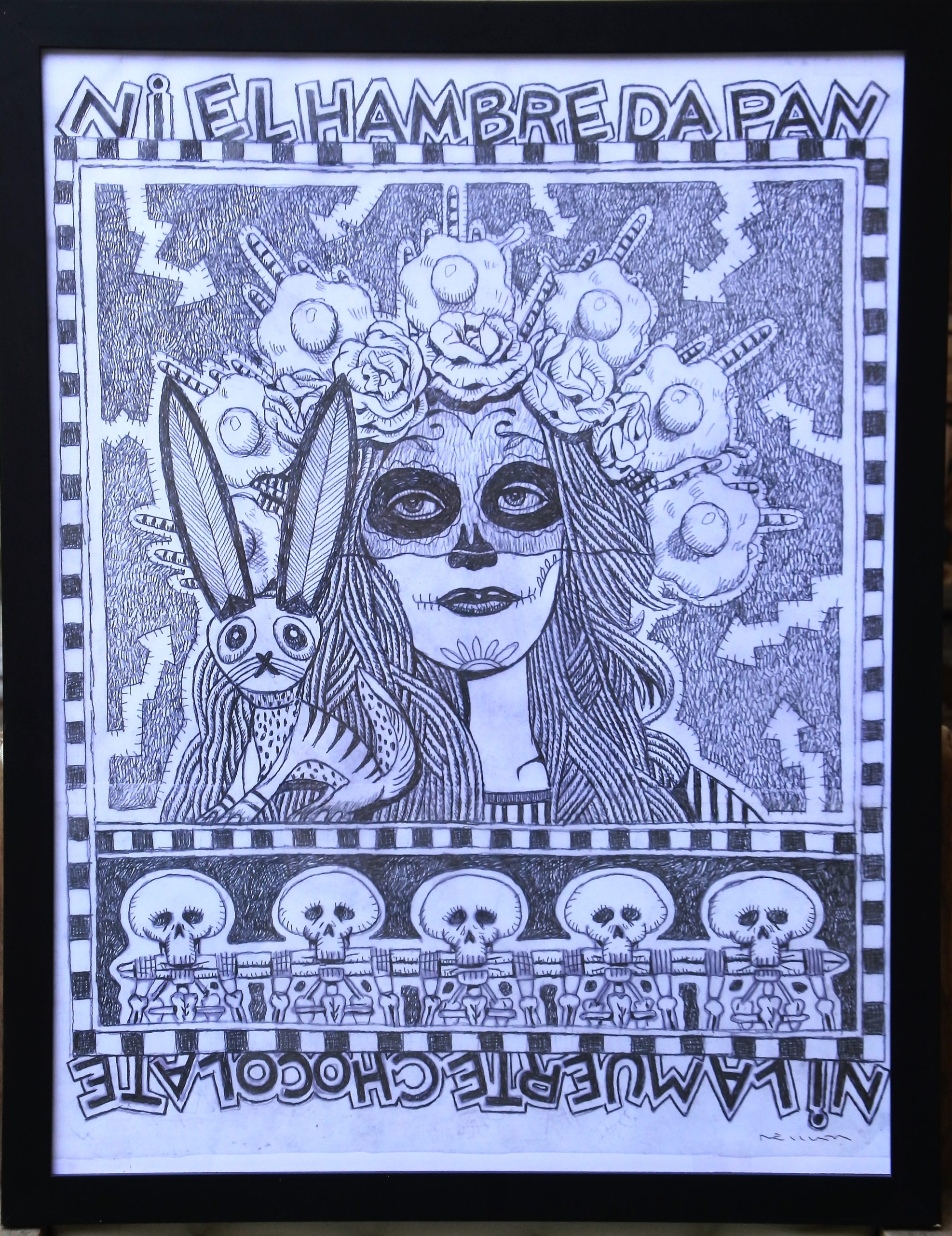 Fernando Bellver – «Ni el hambre da pan ni la muerte chocolate» serie Catrinas, dibujo original grafito sobre acetato de papel, preparatorio para grabado, enmarcado