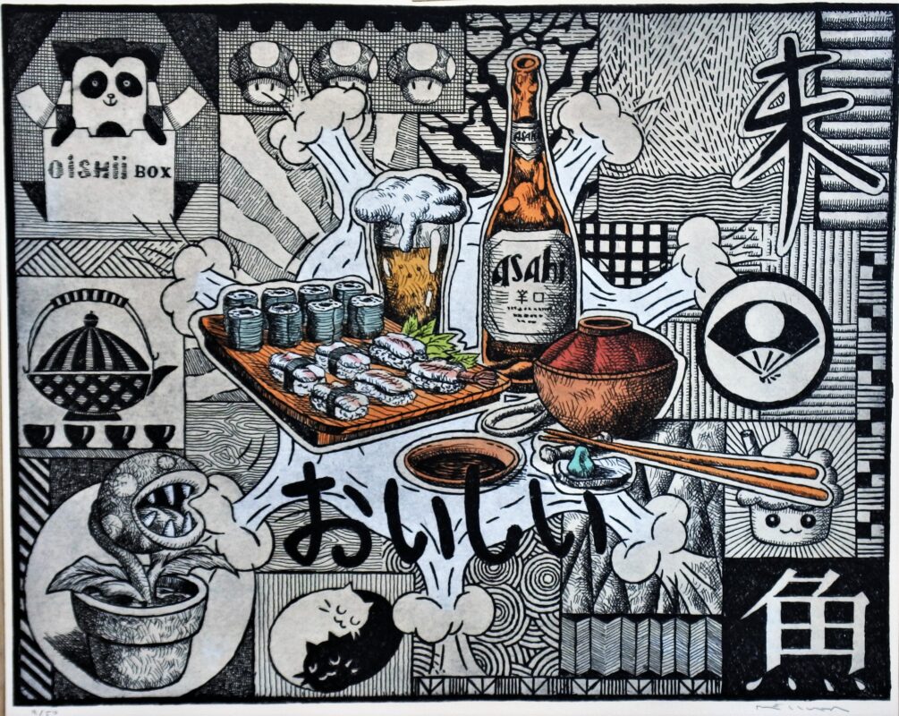 Fernando Bellver, Oishii series, oishi box sushi & sashimi, grabado aguafuerte, edición 50 ejemplares, numerado y firmado a lápiz, 42×50 cms.