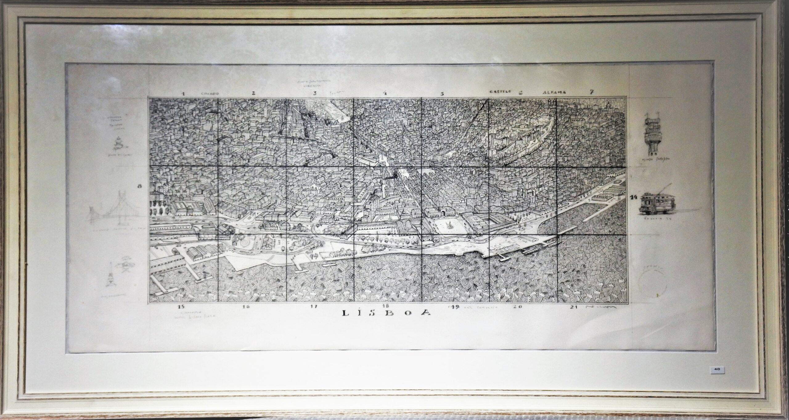 Plano de Lisboa, Dibujo original original, lápiz sobre papel. Enmarcado, dibujo 51×113 cms. y marco 73X136 cms.