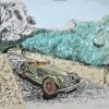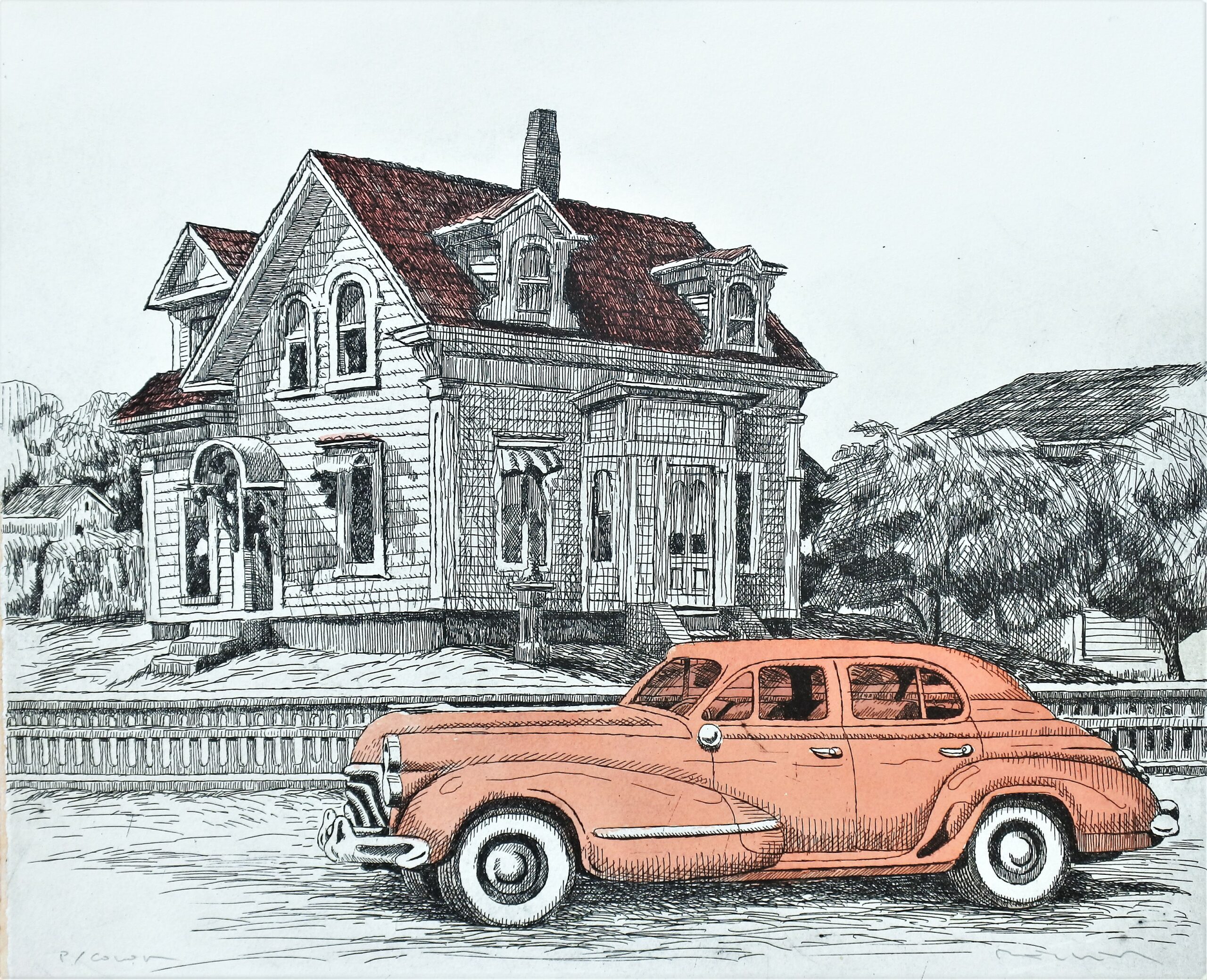Fernando Bellver, Pontiac-Hopper, teja, grabado aguafuerte iluminado a mano, prueba de color, firmado a lápiz, 33×40 cms.