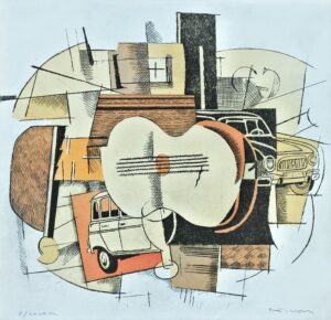 Fernando Bellver, Renaul 4L-Georges Braque, crema, grabado aguafuerte iluminado a mano, prueba de color, firmado a lápiz, 34×35 cms.