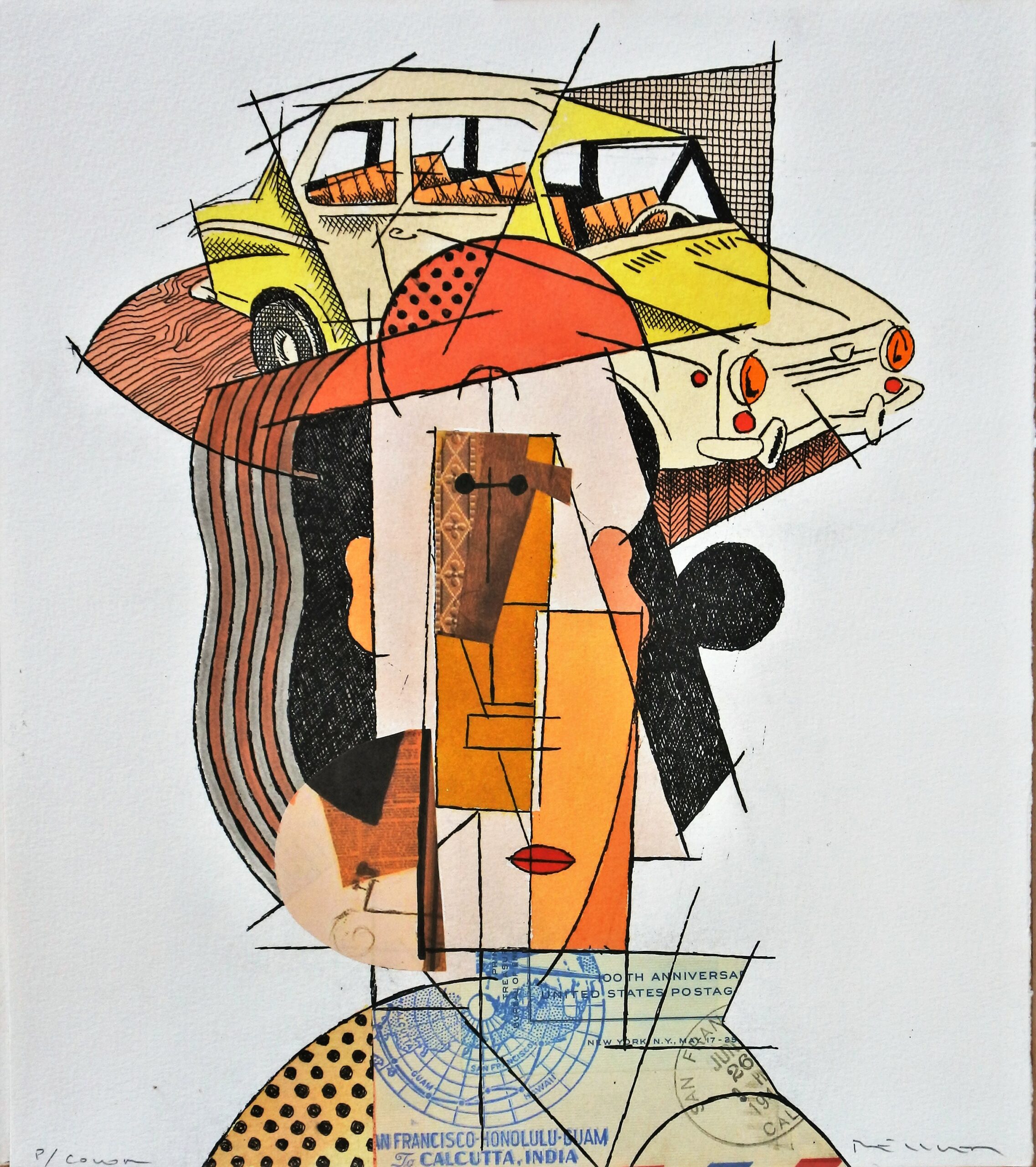 Fernando Bellver, Seat 850-Pablo Picasso, amarillo, grabado aguafuerte iluminado a mano y collage, prueba de color, firmado a lápiz, 33×29 cms.
