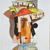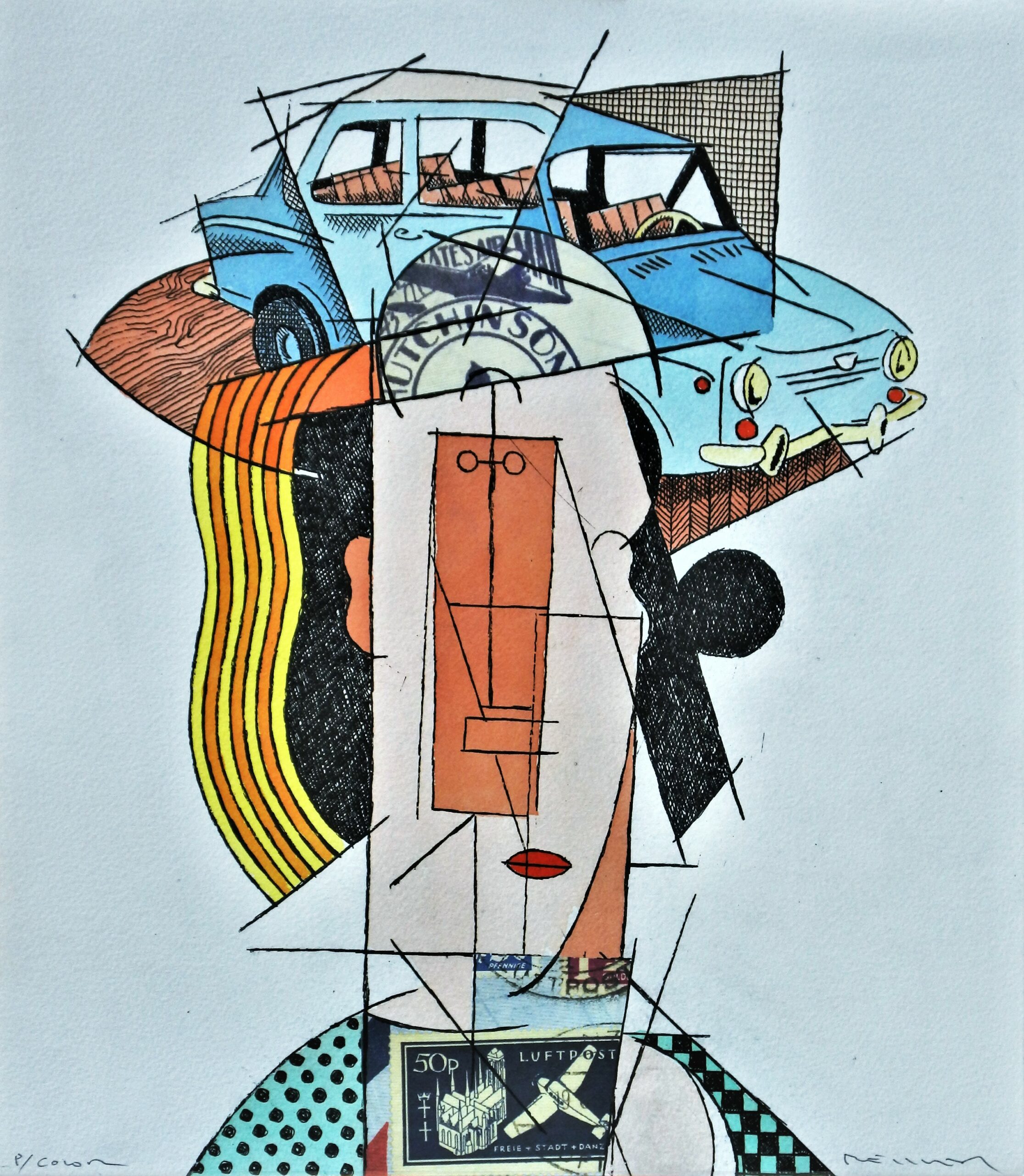 Fernando Bellver, Seat 850-Pablo Picasso, azul, grabado aguafuerte iluminado a mano y collage, prueba de color, firmado a lápiz, 33×29 cms.