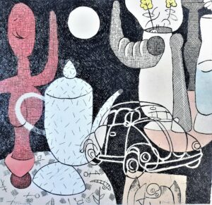 Fernando Bellver, VolksWagen Beetle-Paul Klee, blanco, grabado aguafuerte, prueba de color, iluminado a mano, firmado a lápiz, 33×34 cms.
