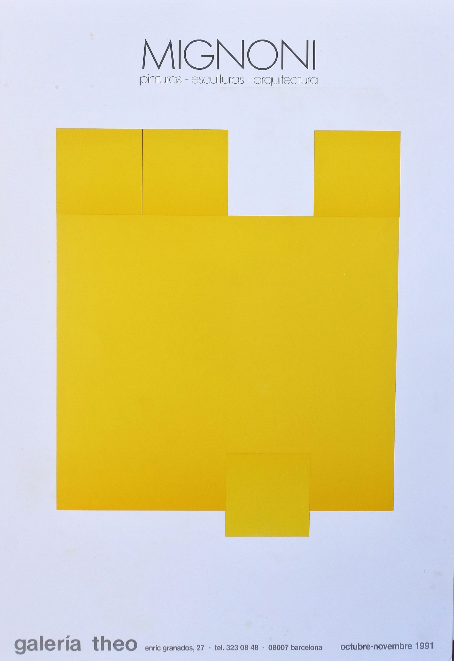 Fernando Mignoni, Pinturas, esculturas, arquitectura, cartel original exposición en la Galeria Theo Barcelona en 1991, 64×44 cms.