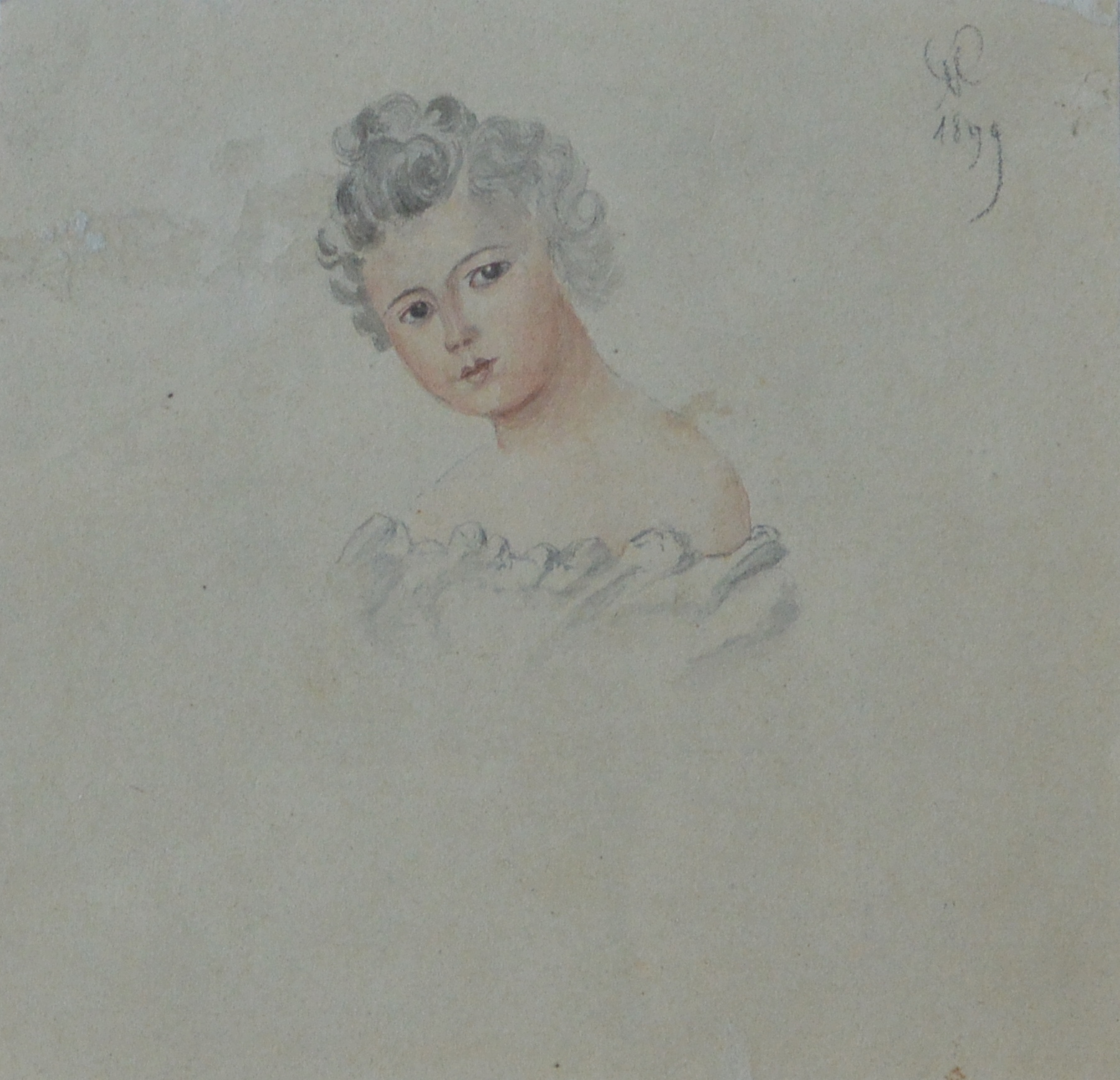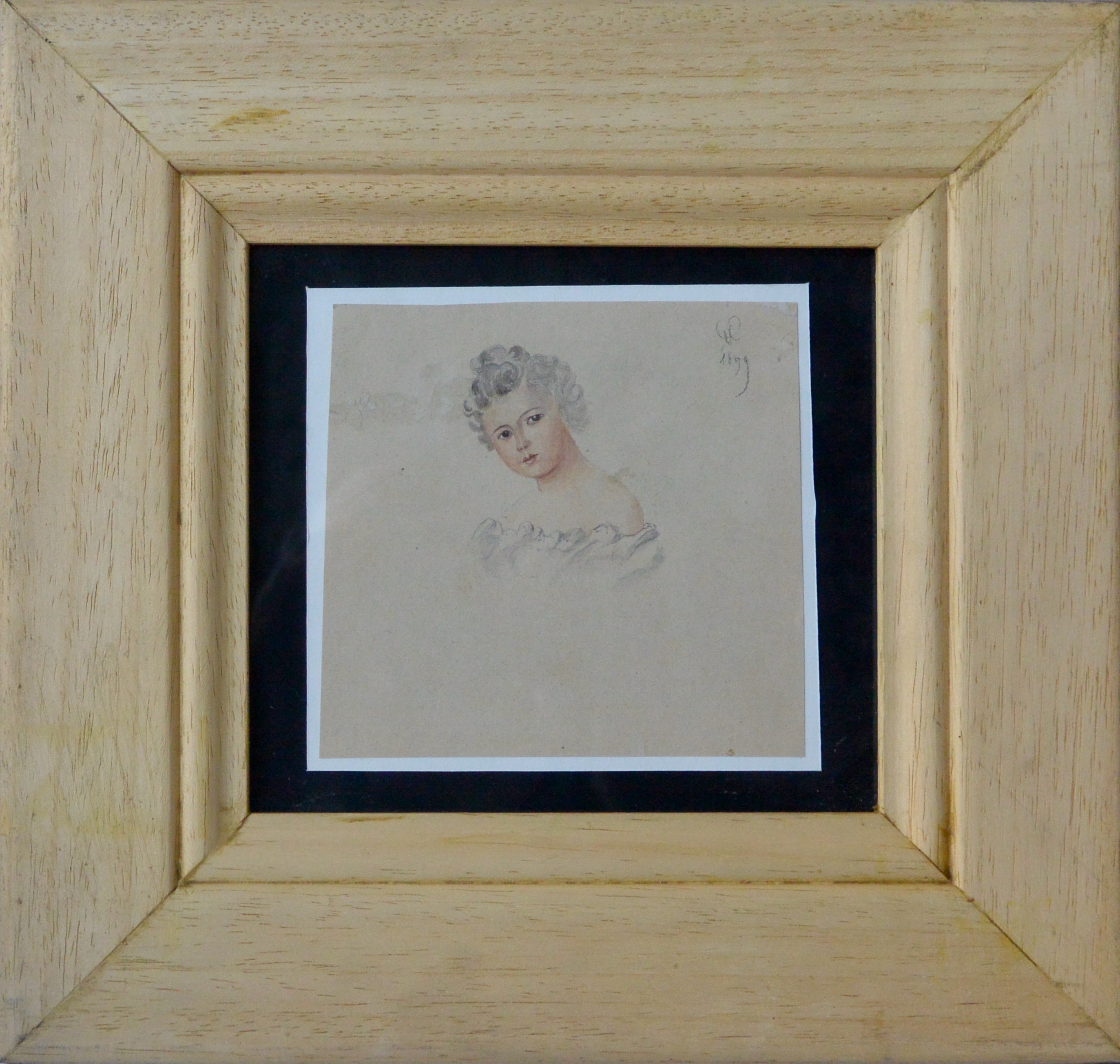 Firma Ilegible, Retrato de niña, dibujo lápiz y acuarela papel, enmarcado, datado 1899, dibujo 11×11,50 cms. y marco 25×26 cms. Marco incluido