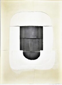 Amadeo Gabino, Espejos cóncavos, escultura collage metal y cartulinas recortadas, enmarcado, pieza única, escultura 69×50 cms. y marco 77×57 cms.