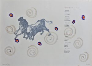 Gonzalo Torné – «El estudiante de Falces, Plaza Partida, variaciones goyescas» litografía y acuarela con poema de Mario Hernandez