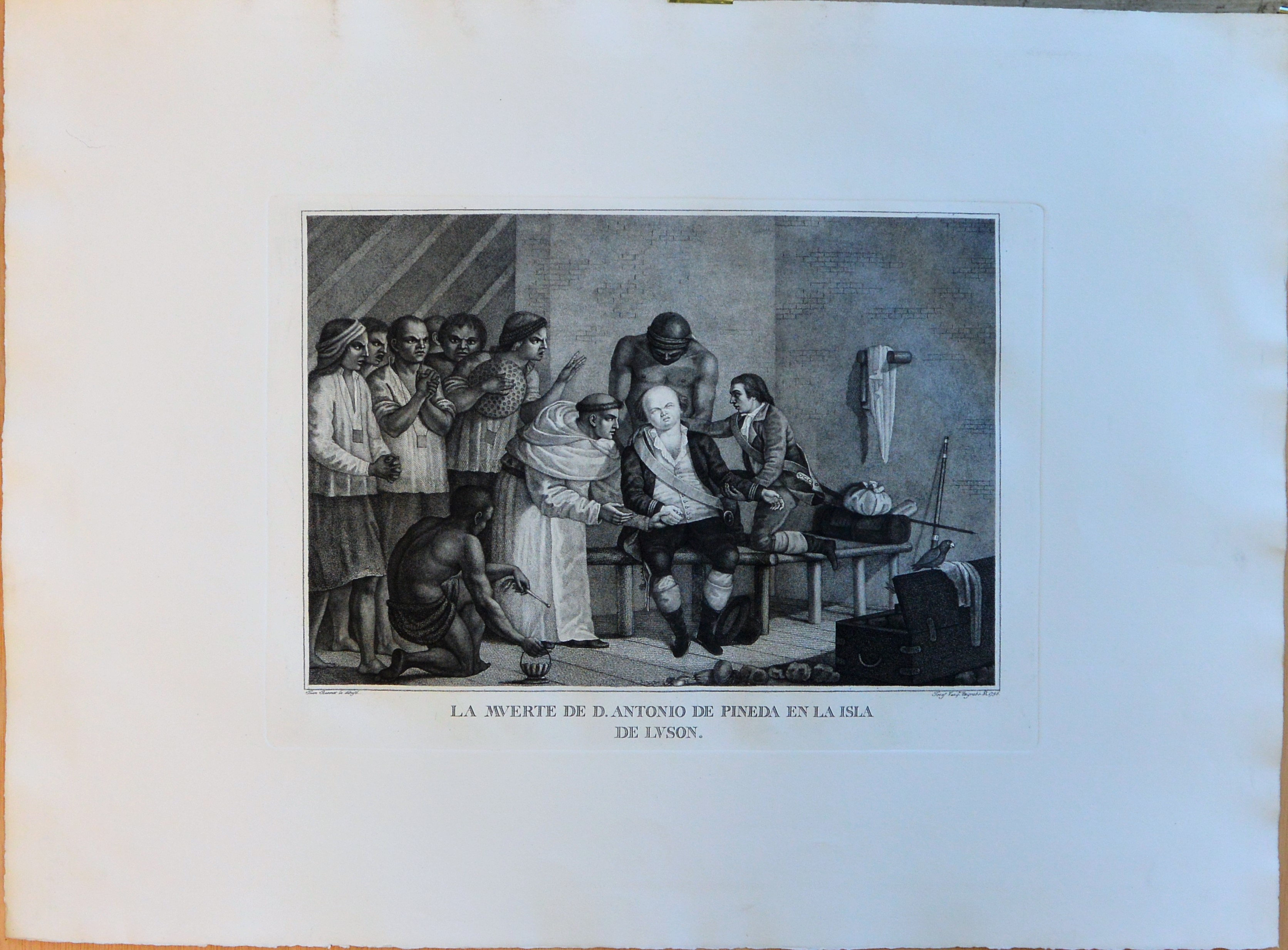 La muerte de D. Antonio de Pineda en la isla de Lusón, grabado, plancha 32×45 cms. y papel 55,50×76 cms.