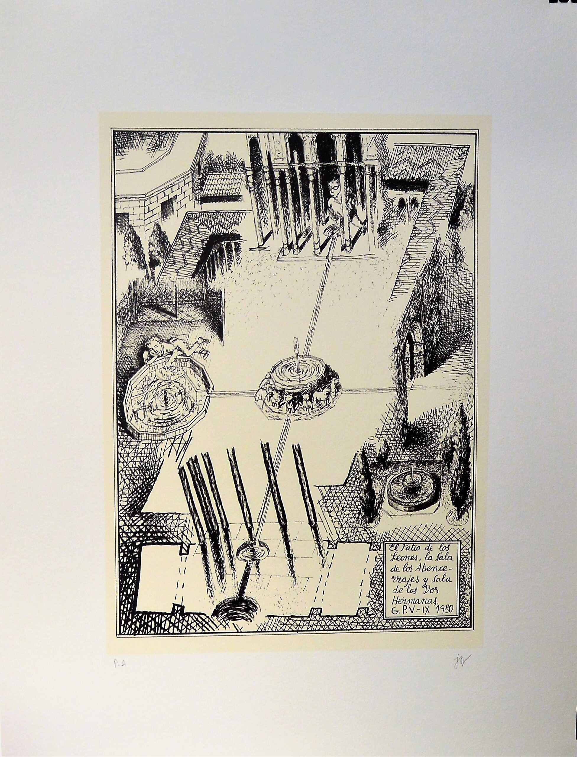 Guillermo Perez Villalta, Una visita a la Alhambra, el patio de los leones, serigrafía, edición 75 ejemplares, numerado pa y firmado a lápiz, 65×50 cms.