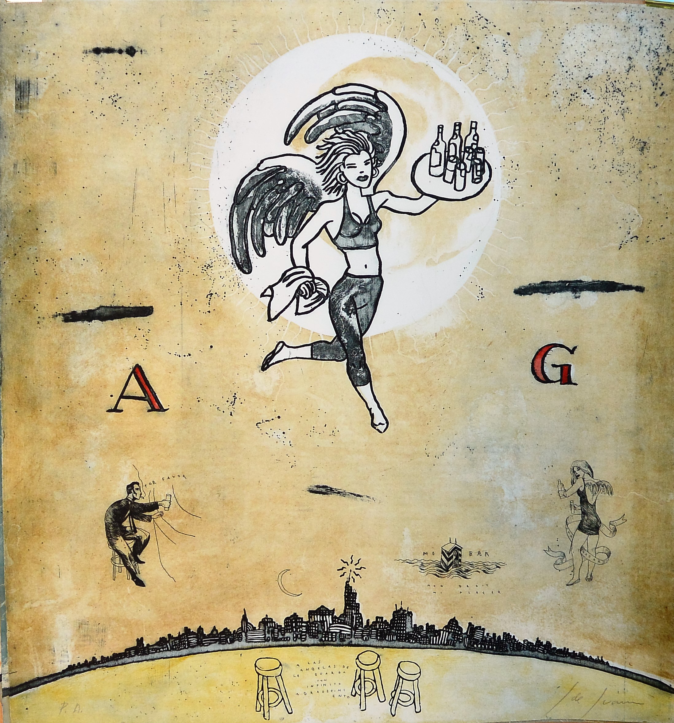 Javier de Juan, A las angelas de la guarda, fondo beige, grabado, numerado pa y firmado a lápiz, 80×75 cms.