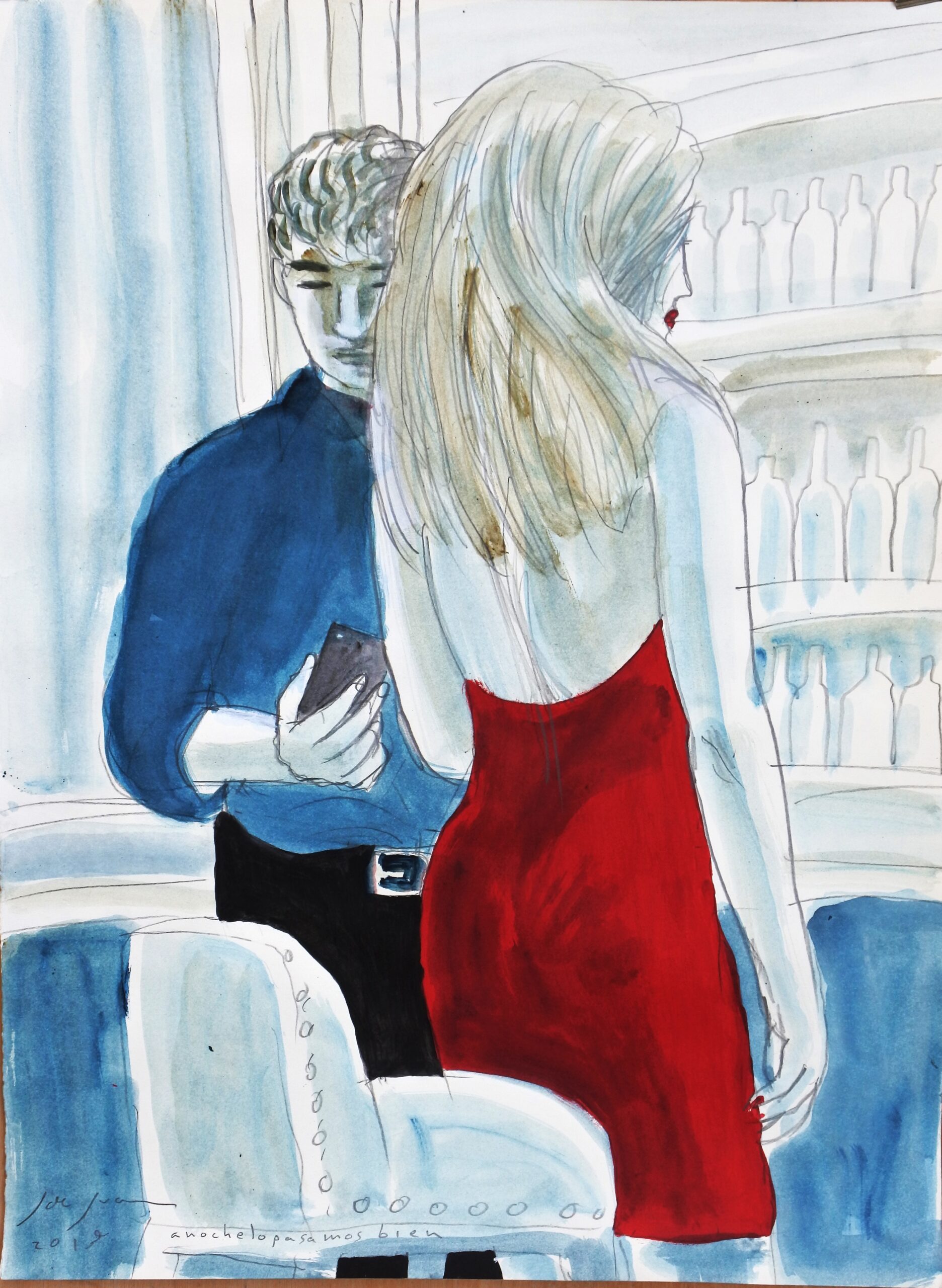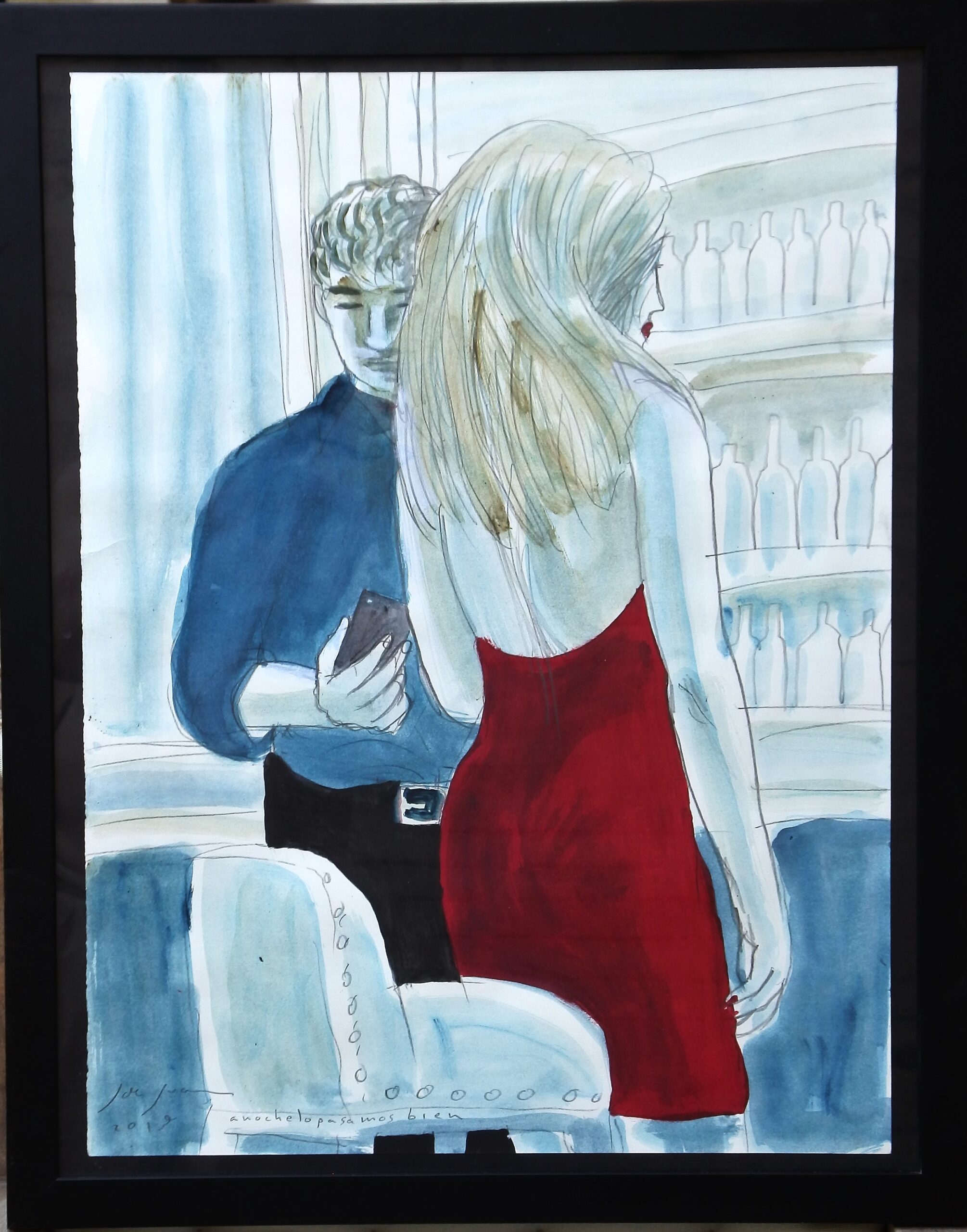 Javier de Juan – «Aún es pronto» serie anoche lo pasamos bien, pintura original acrílico sobre cartulina, enmarcado