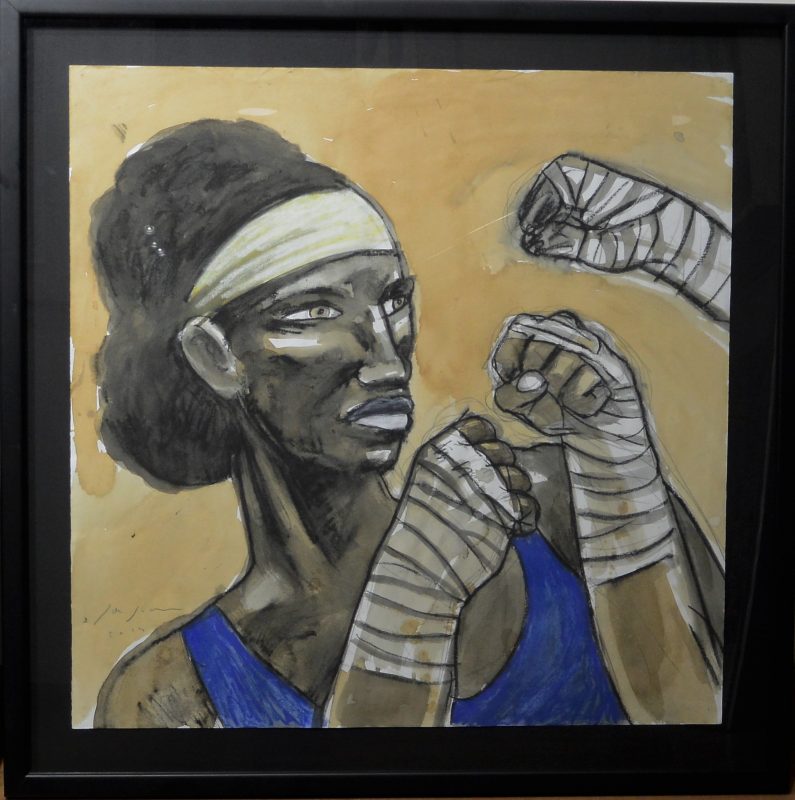 Javier de Juan, Boxing girl, dibujo original técnica mixta papel, enmarcado, dibujo 70×70 cms. y marco 84×84 cms.