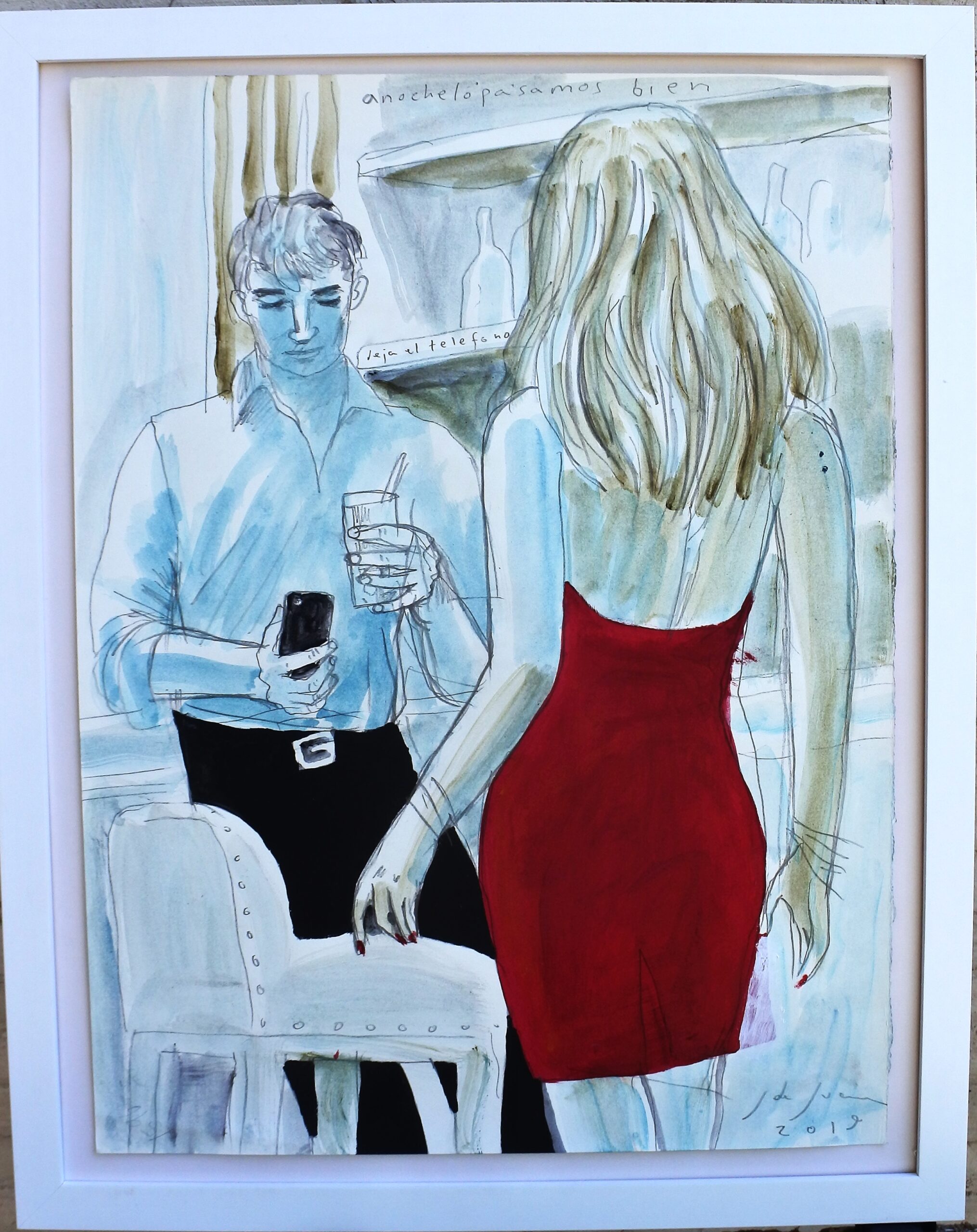 Javier de Juan – «Deja el teléfono» Serie anoche lo pasamos bien, pintura original acrílico cartulina, enmarcado