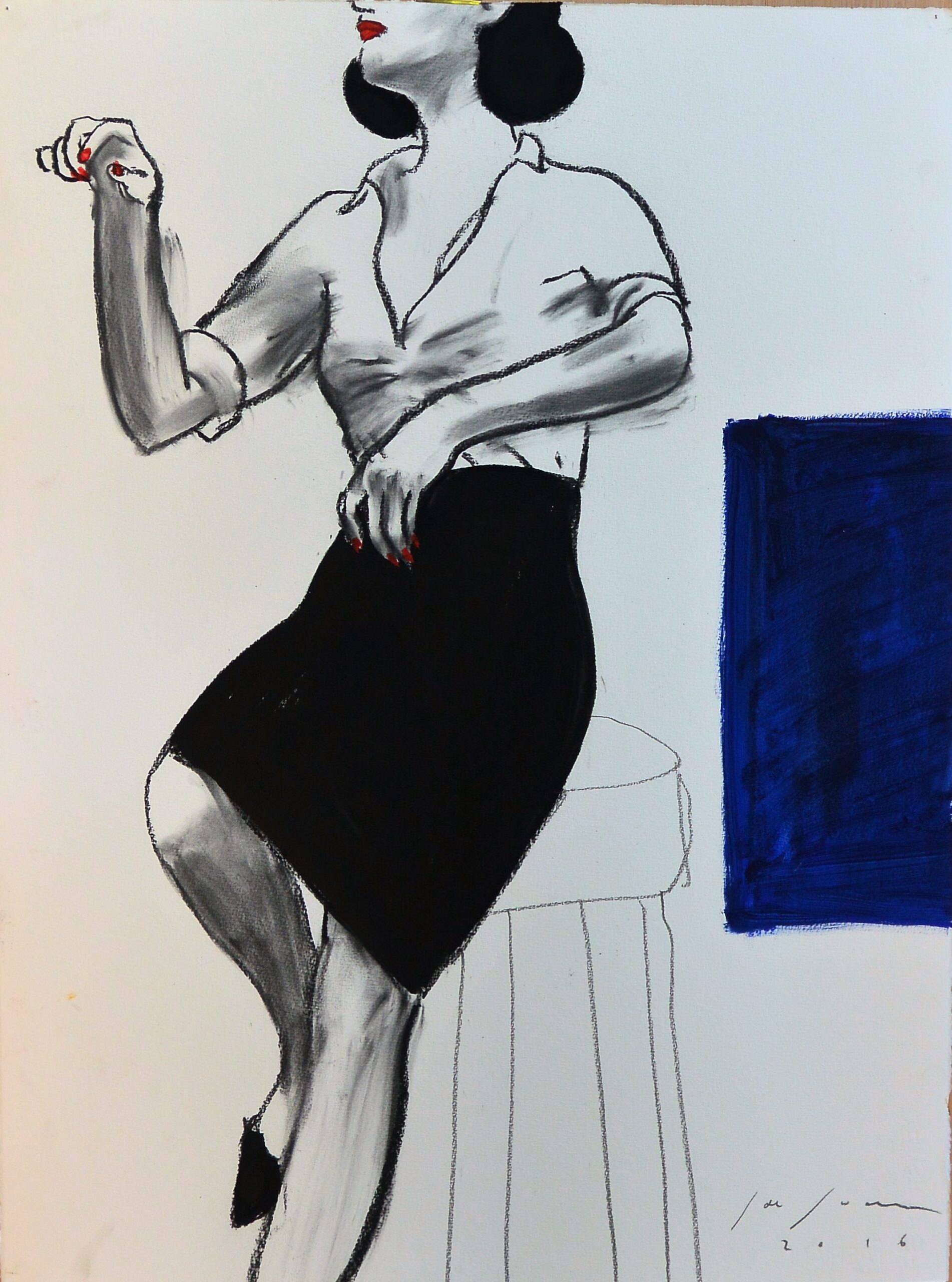 Javier de Juan, Espera sentada, pintura oleo en barra, tinta y carboncillo papel, 76×57 cms.